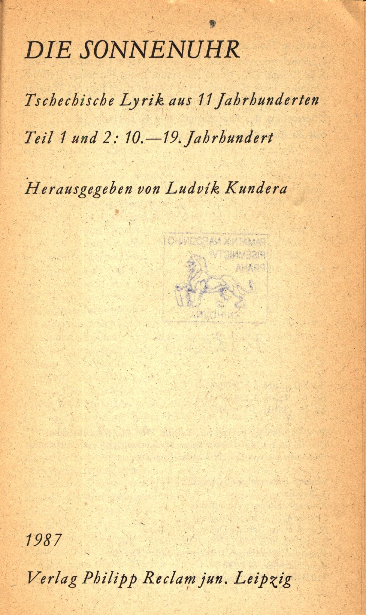 Názvové údaje Die Sonnenuhr : tschechische Lyrik aus 11 Jahrhunderten. Teil 1 und 2, 10.-19. Jahrhundert herausgegeben von Ludvík Kundera Osobní jméno Kundera, Ludvík, 1920-2010 (Editor) (Překladatel) (Autor úvodu atd.) Další autoři Philipp Reclam jun. (nakladatelství a tiskárna) (Nakladatel, vydavatel) Grafischer Grossbetrieb Völkerfreundschaft Dresden (Tiskař) Údaje o vydání 1. Auflage Nakladatel Leipzig : Philipp Reclam jun., 1987 Výrobce Dresden : Grafischer Grossbertieb Völkerfreundschaft Rozsah 261 stran : ilustrace, faksimile ; 18 cm ISBN 3-379-00043-4 (Brožováno) Edice Reclams Universal-Bibliothek. Belletristik ; Band 1153