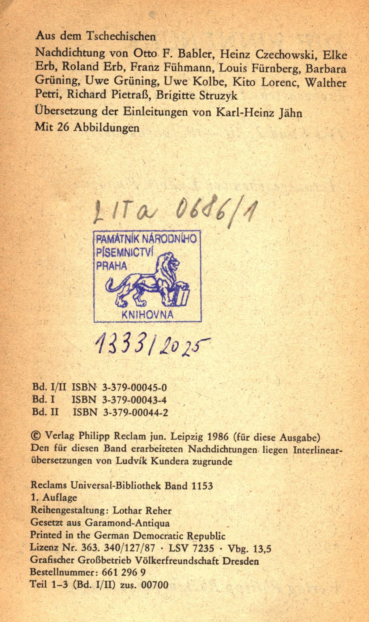 Reclams Universal-Bibliothek. Belletristik (Philipp Reclam jun.)Země vyd. Německo Jazyk dok. němčina Jazyk orig. čeština Poznámky "Den für diesen Band erarbeiteten Nachdichtungen liegen Interlinearübersetzungen von Ludvík Kundera zugrunde"--Rub titulní stránky