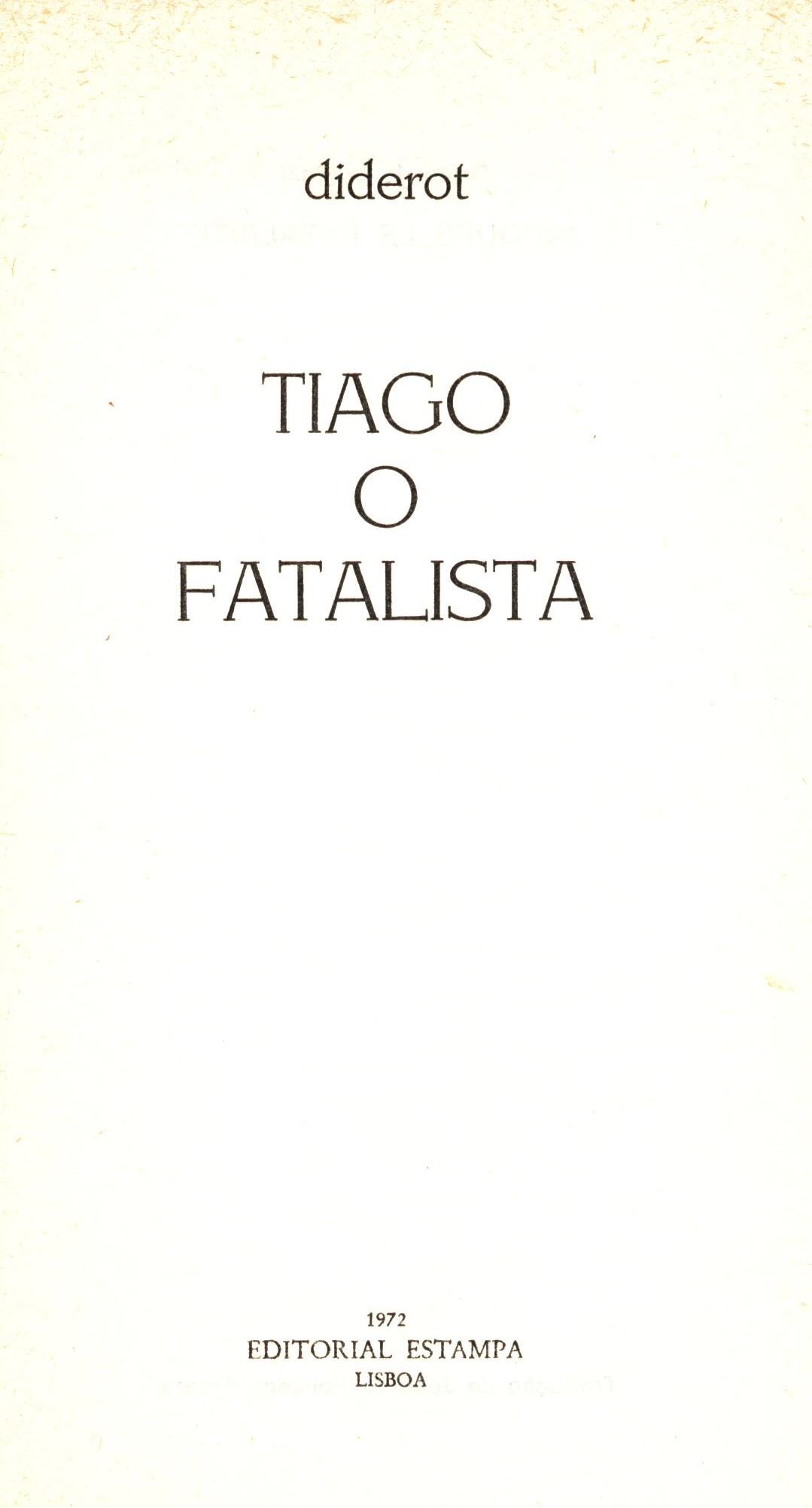 Názvové údaje Tiago o fatalista / Diderot Osobní jméno Diderot, Denis, 1713-1784 (Autor) Další autoři Editorial Estampa (Nakladatel, vydavatel) Guide – Artes Gráficas, Lda. (Tiskař) Nakladatel Lisabon : Editorial Estampa, 1972 Výrobce Guide – Artes Gráficas, Lda., Rozsah 237 stran ; 18 cm ISBN (Brožováno) Edice Clássicos de bolso, 30/31.