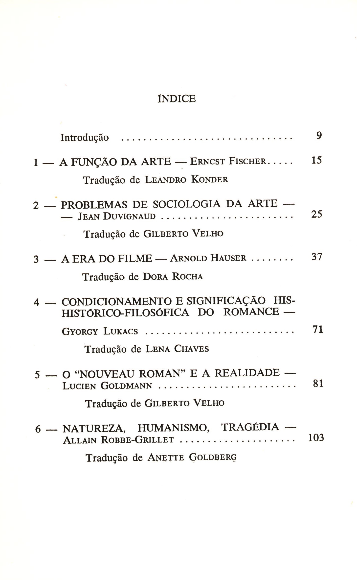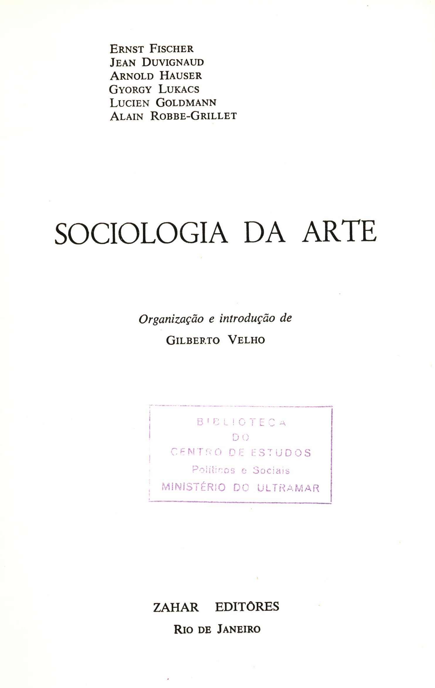 Názvové údaje Sociologia da arte Organização e introdução de Gilberto Velho Osobní jméno Velho, Gilberto (Editor) (Autor úvodu atd.) Další autoři Zahar Editores (Nakladatel, vydavatel) Nakladatel Rio de Janeiro : Zahar Editores, 1966 Rozsah 121 stran ; 21 cm ISBN (Vázáno) Edice Textos básicos de ciências sociais