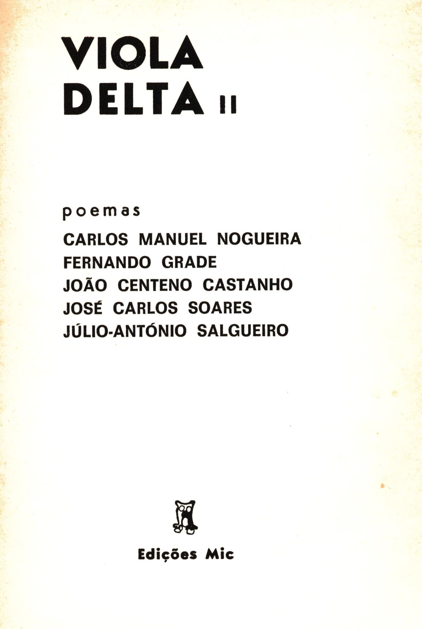 1. Názvové údajeViola delta II : Poemas / Carlos Manuel Nogueira ; Fernando Grade ; João Centeno Castanho ; José Carlos Soares ; Júlio-António Salgueiro