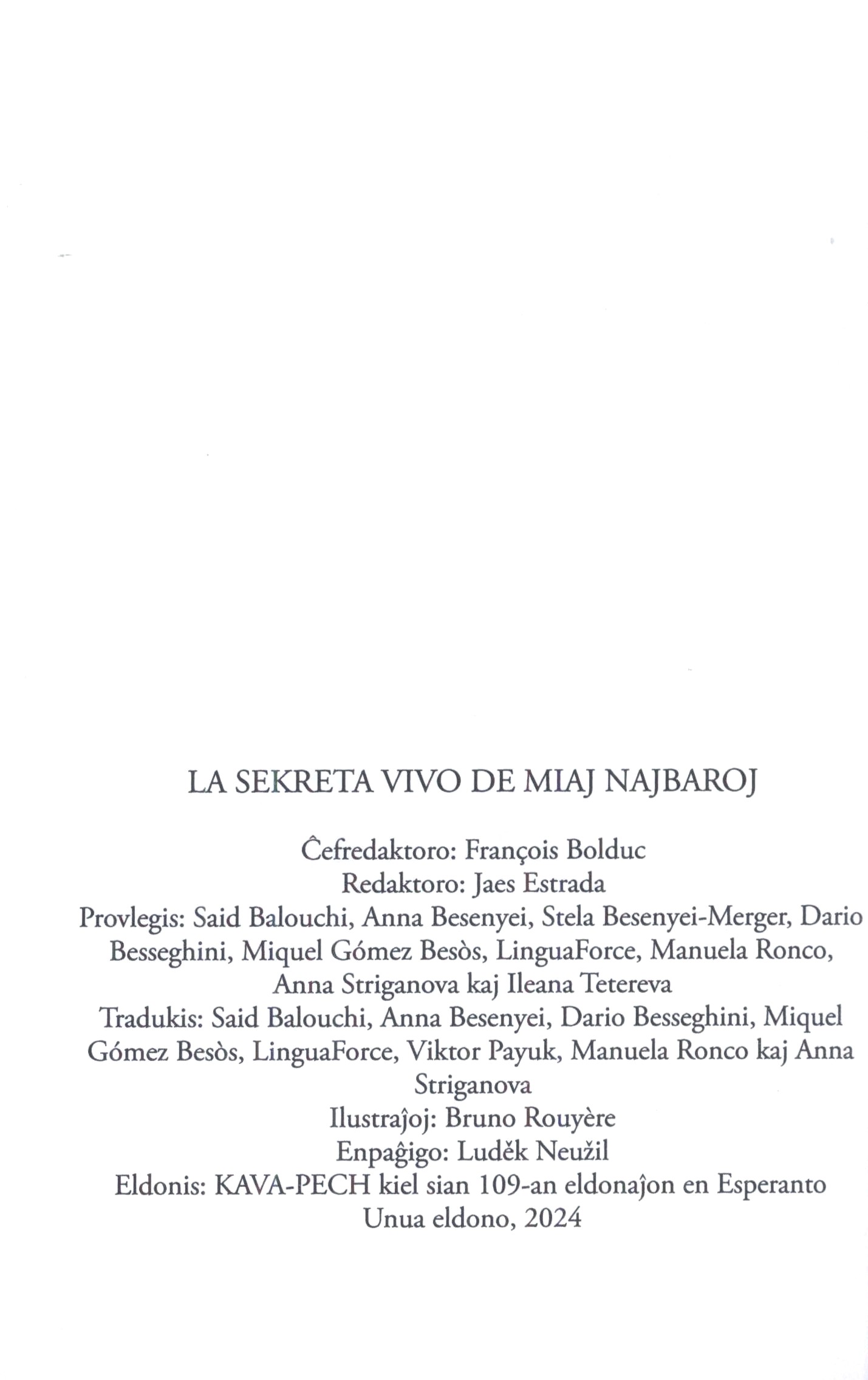 1. Názvové údajeLa sekreta vivo de miaj najbaroj / ĉefredaktoro: François Bolduc ; ilustraĵoj: Bruno Rouyère ; enpaĝigo: Luděk Neužil