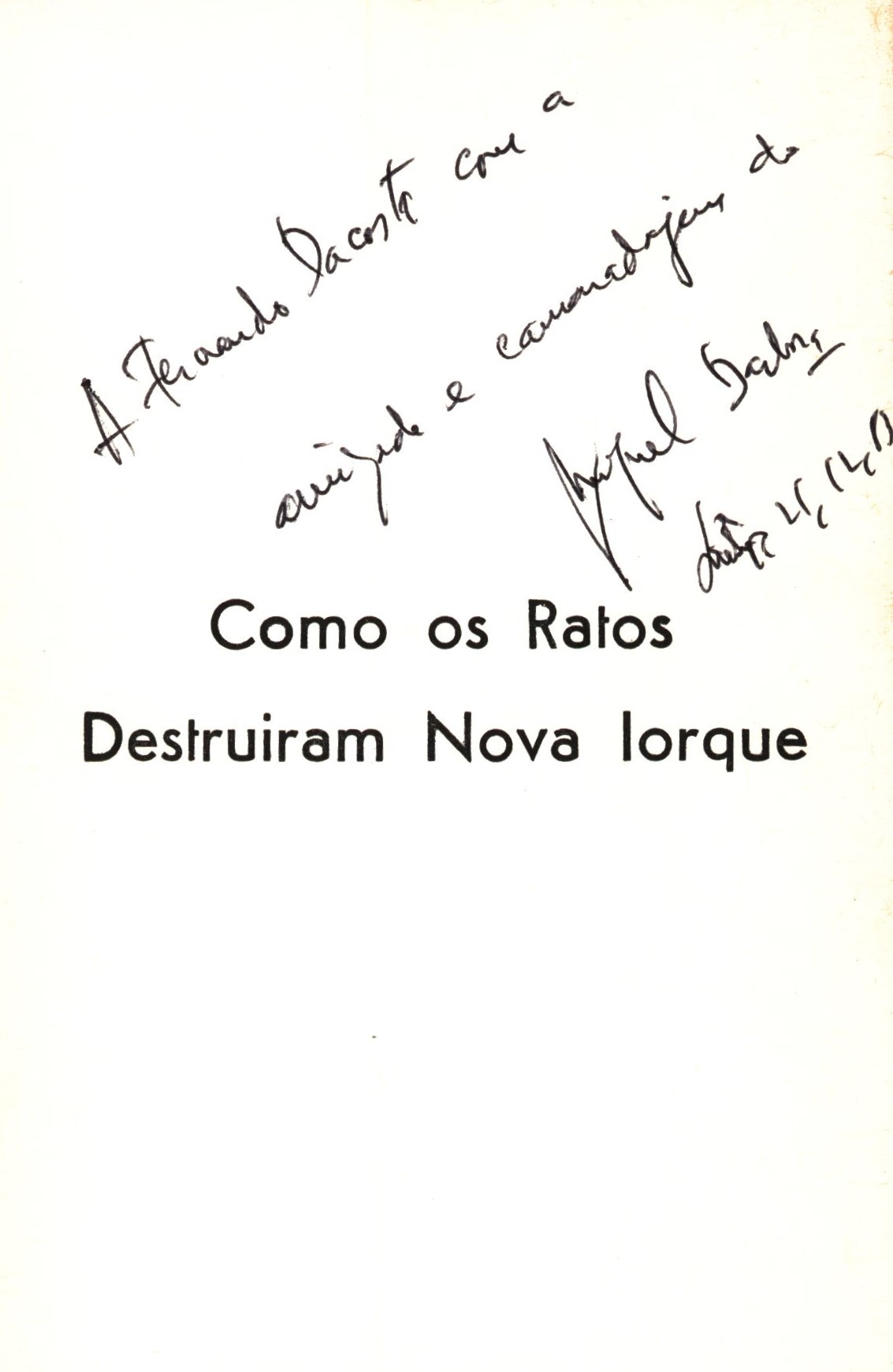 Názvové údaje Como os Ratos Destruiram Nova Iorque / Miguel Barbosa Osobní jméno Barbosa, Miguel, 1925-2019 (Autor) Další autoři Sociedade Portuguesa de Autores (Nakladatel, vydavatel) Nakladatel Lisabon : Sociedade Portuguesa de Autores, 1983 Rozsah 102 stran: čb. fotografie ; 16 cm ISBN (Brožováno) Země vyd. Portugalsko Jazyk dok. portugalština Poznámky Zdobená obálka. - Typografický titulní list. - Na zadní straně obálky informace o autorovi.