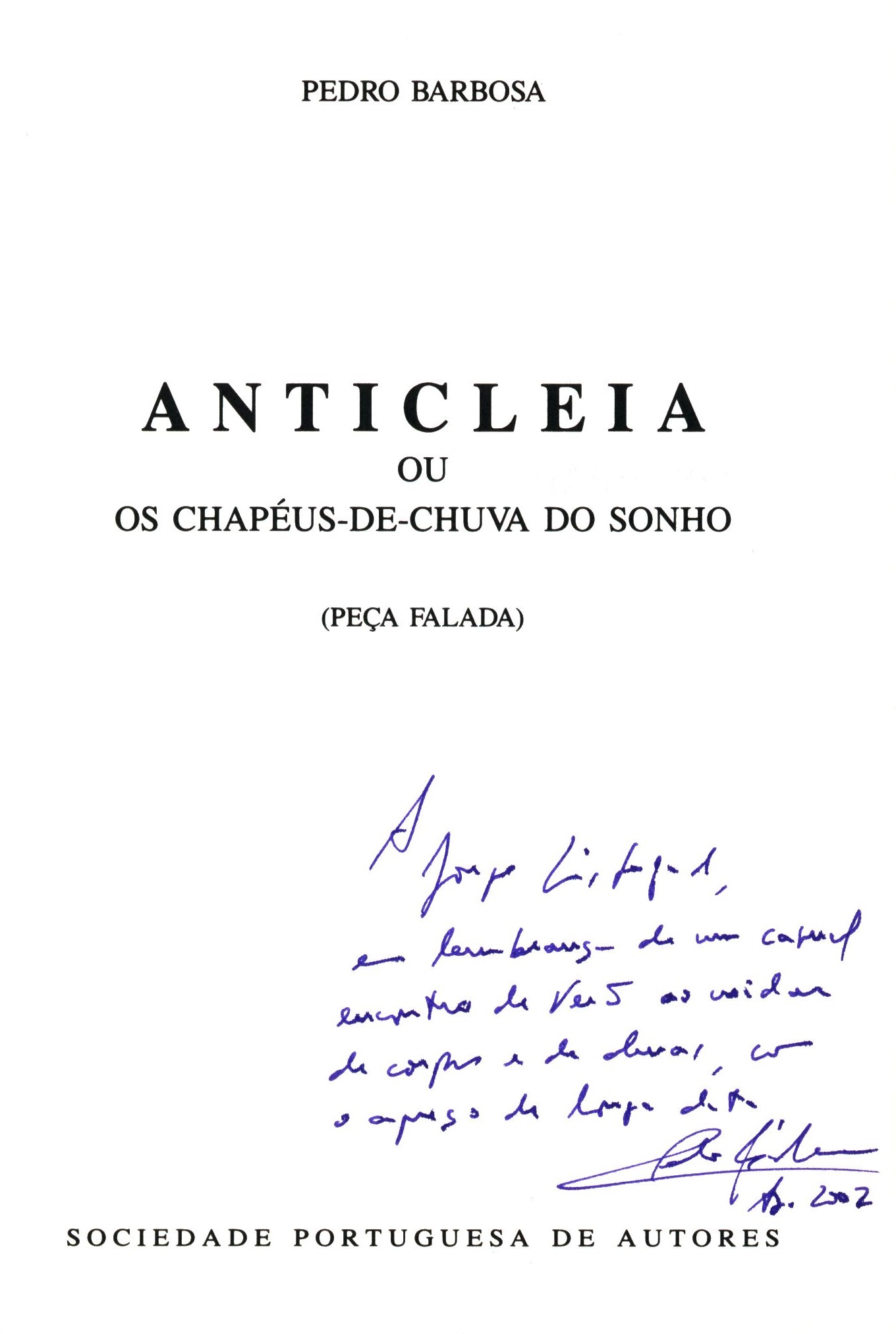 Názvové údaje Anticleia : ou os chapéus-de-chuva do sonho (peça falada) / Pedro Barbosa Osobní jméno Barbosa, Pedro, 1950- Další autoři Sociedade Portuguesa de Autores (Nakladatel, vydavatel) Óptima Tipográfica (Tiskař) Údaje o vydání 1.a Edição Nakladatel Lisboa : Sociedade Portuguesa de Autores, 1992 Výrobce Casais de Serra ; Malveira : Óptima Tipográfica Rozsah 85 stran ; 18 cm ISBN (Brožováno) Země vyd. Portugalsko Jazyk dok. portugalština Poznámky Zdobená obálka. - Doslov. - Na zadní straně obálky poznámka o autorovi s čb. ilustrací