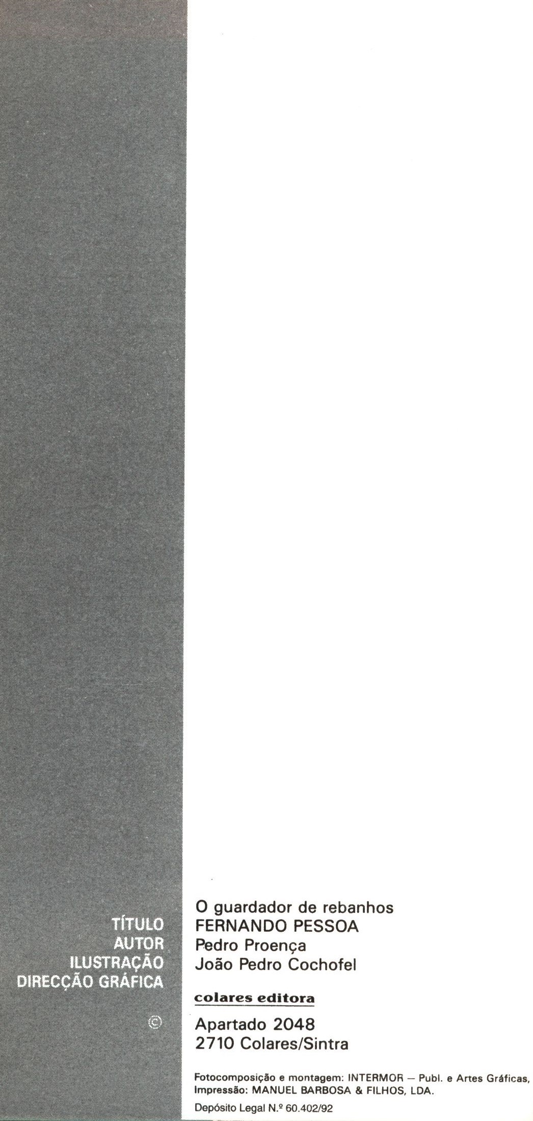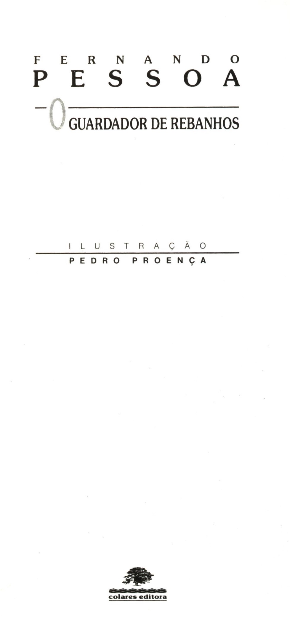 Názvové údaje O guardador de rebanhos / Fernando Pessoa ; ilustração Pedro Proença Osobní jméno Pessoa, Fernando, 1888-1935 (Autor) Další autoři Proença, Pedro (Ilustrátor) Korp. Colares editora (Nakladatel, vydavatel) Gráfica Manuel Barbosa e Filhos (firma) (Tiskař) Nakladatel Sintra : Colares editora, [1992] Výrobce Gráfica Manuel Barbosa e Filhos Rozsah 30 nečíslovaných stran : čb. ilustrace ; 19 cm ISBN (Brožováno) Edice Livro carta