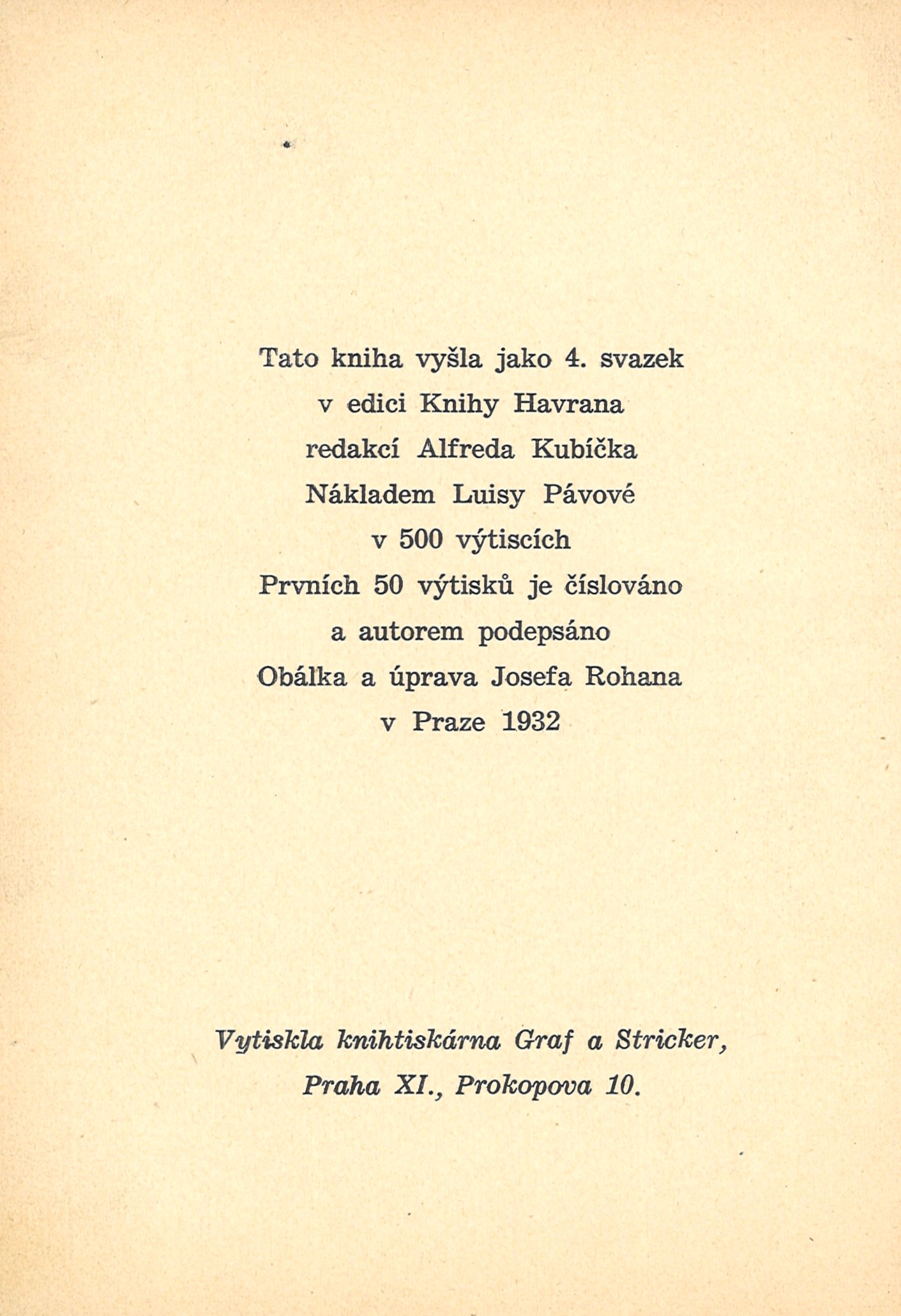 Nakladatelské údaje: Na titulním listu uvedeno Nakladatelství mladých, v tiráži Komand. nakl. společnost Pašek a spol., přičemž Nakladatelství mladých je označeno za edici