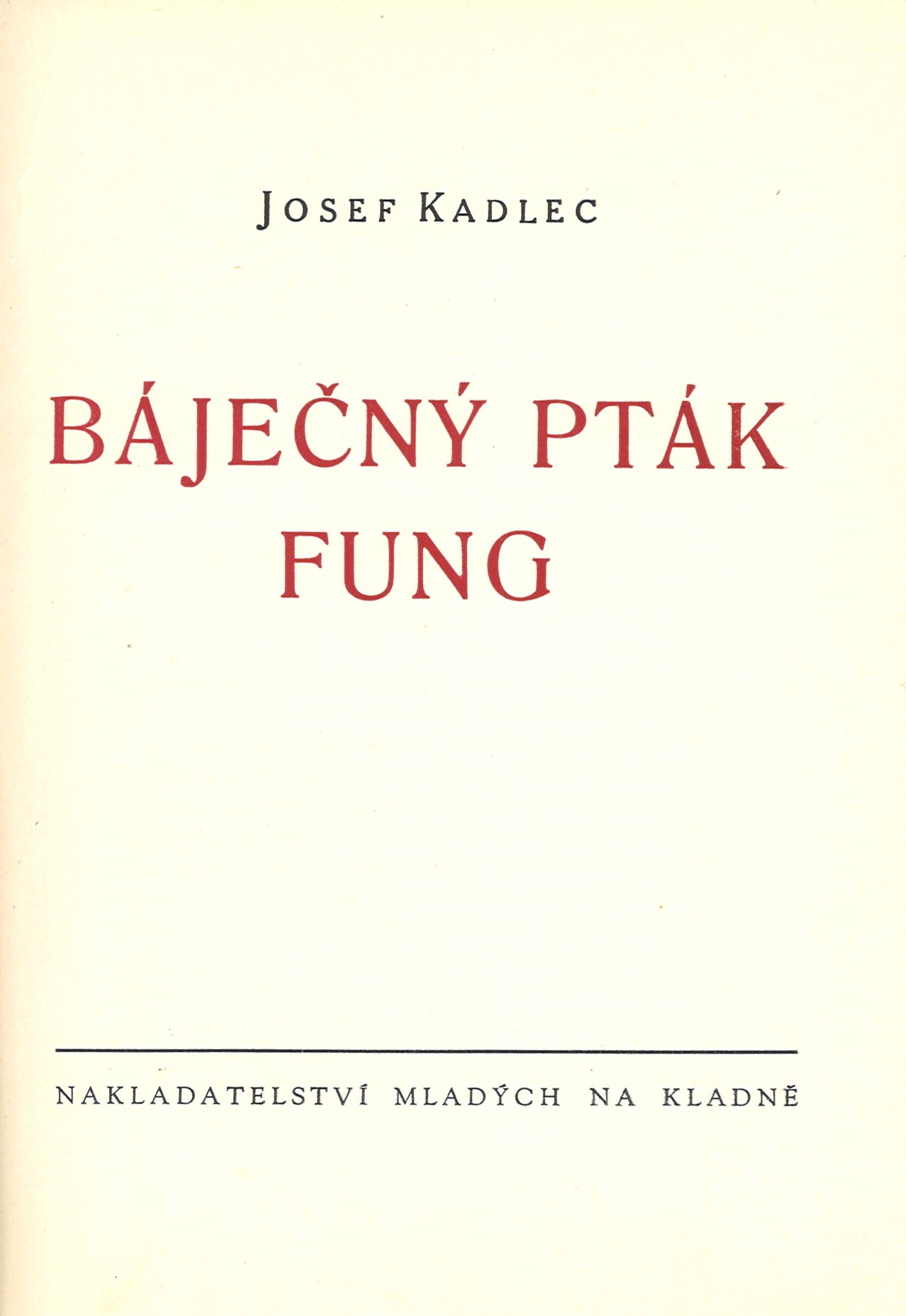Názvové údaje Báječný pták Fung / Josef Kadlec Osobní jméno Kadlec, Josef, 1912-2000 (Autor) Další autoři Nakladatelství mladých (Kladno) (Nakladatel, vydavatel) R. Nunhardt (tiskárna) Údaje o vydání Vydání 1. Nakladatel Na Kladně : Komand. nakl. společnost Pašek a spol., 1948 Výrobce Litoměřice : R. Nunhardt, n.s. Rozsah 79 stran ; 21 cm ISBN (Vázáno) Edice Nakladatelství mladých ; svazek 53