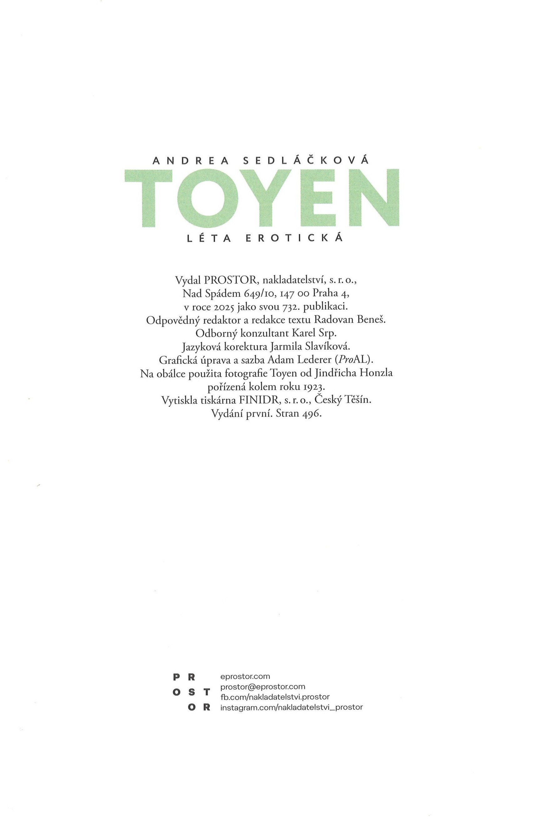 Názvové údaje Toyen : léta erotická / Andrea Sedláčková ; grafická úprava a sazba Adam Lederer (ProAL) Osobní jméno Sedláčková, Andrea, 1967- (Autor) Další autoři Toyen, 1902-1980 (Ilustrátor) Lederer, Adam, 1979- (Knižní grafik) (Sazeč) Honzl, Jindřich, 1894-1953 (Fotograf) Srp, Karel, 1958- (Autor úvodu atd.) Dospěl, Milan, 1980- (Autor doslovu, tiráže atd.) Sedláčková, Andrea, 1967- Toyen - první dáma surrealismu Korp. Prostor (nakladatelství) (Nakladatel, vydavatel) Finidr (tiskárna) (Tiskař) Údaje o vydání Vydání první Nakladatel Praha : Prostor, 2025 Výrobce Český Těšín : Finidr, s.r.o. Rozsah 491 stran : ilustrace (převážně barevné), portréty, faksimile ; 25 cm ISBN 978-80-7260-655-9 (soubor) 978-80-7260-638-2 (vázáno) Země vyd. Česko Jazyk dok. čeština Poznámky Zdobená barevná obálka. - Zelená celoplátěná vazba s černým textem. - Na přední záložce obálky anotace knihy, na zadní záložce bio-bibliografická poznámka o autorce s fotem. - Černé předsádky. - Frontispis. - Obsah. - Předmluva (K. Srp). - Prolog. - Barevné, tónované a černobílé fotografie, ilustrace, portréty a faksimile s popiskami. - Epilog. - Poděkování autorky. - Poděkování nakladatele. - Seznam děl reprodukovaných v knize. - Seznam osobností. - Zdrojové materiály. - Paradoxy Toyen (M. Dospěl). - Na zadní straně obálky úryvek z předmluvy K. Srpa a ukázka z knihy.