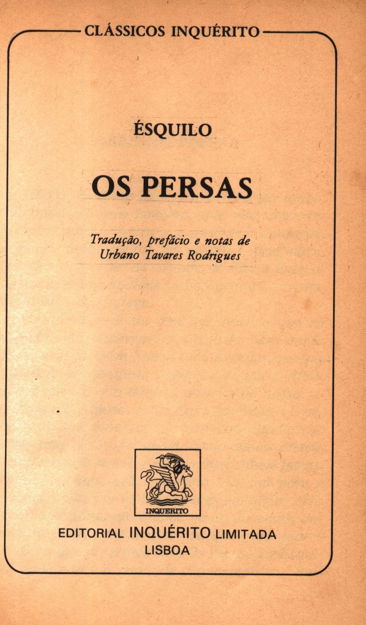 Názvové údaje Os Persas / Ésquilo ; tradução, prefácio e notas de Urbano Tavares Rodrigues ; capa: estúdios P. E. A. ; editor: Francisco Lyon de Castro Autor Aischylos, 525-456 př.n.l. (Autor) Další autoři Rodrigues, Urbano Tavares, 1923-2013 (Překladatel) (Autor úvodu atd.) (Autor komentáře) Lyon de Castro, Francisco (Editor) Korp. Inquérito (Nakladatel, vydavatel) estúdios P. E. A. (Autor obálky) Nakladatel Lisboa : Inquérito, [1984] Rozsah 66 stran : čb. ilustrace ; 18 cm ISBN (Brožováno) Edice Clássicos Inquérito (Inquérito) ; 7