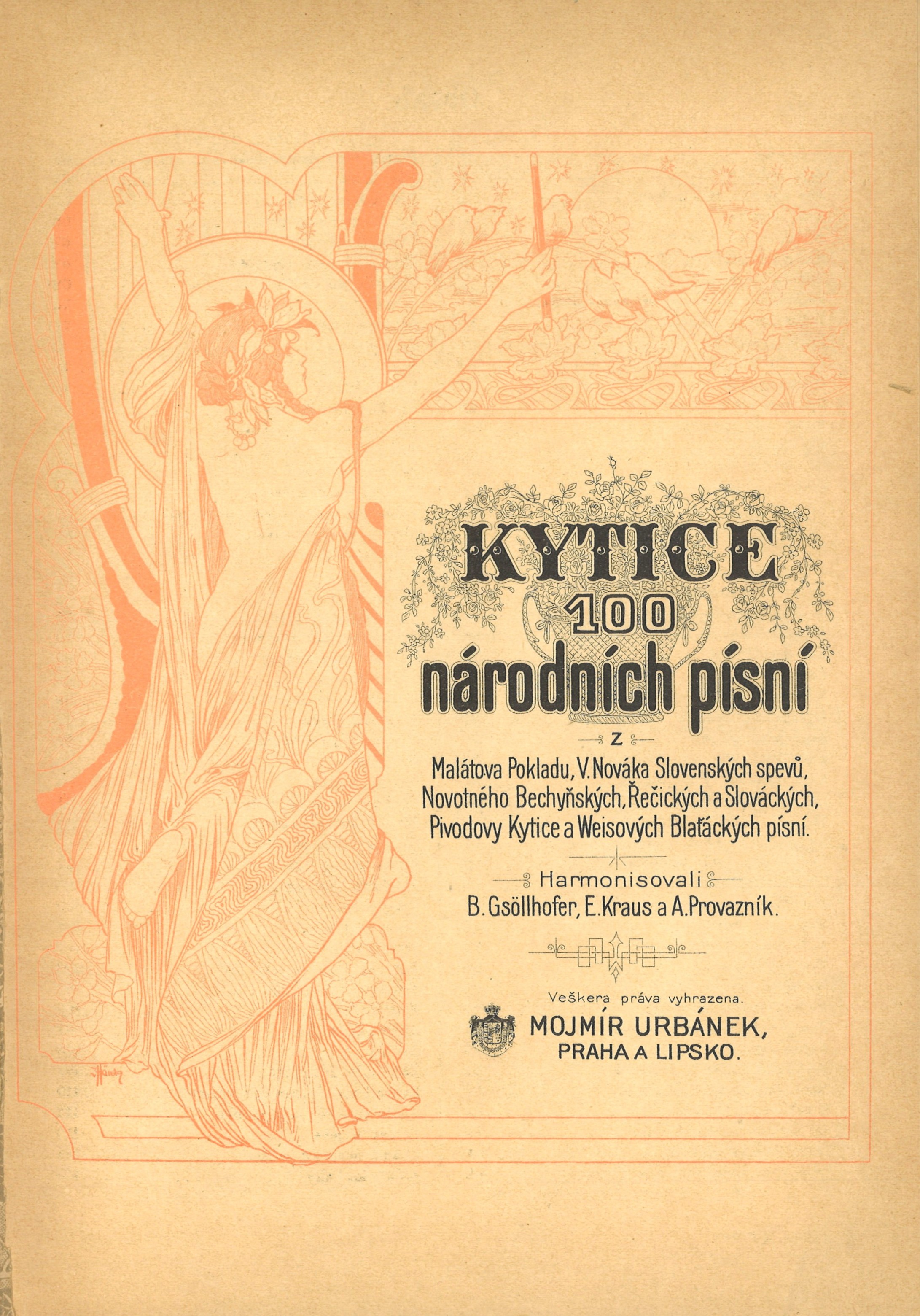 Edition M.U., (Miloš Urbánek)Země vyd. Česko Jazyk dok. čeština * slovenština Poznámky Celoplátěná secesní vazba s tiskem a zlacením. - Bez přebalu. - Zdobené předsádky. - Secesně ilustrovaný titulní list. - Rok vydání neuveden. - Obsah (seznam písní). - Bez tiráže
