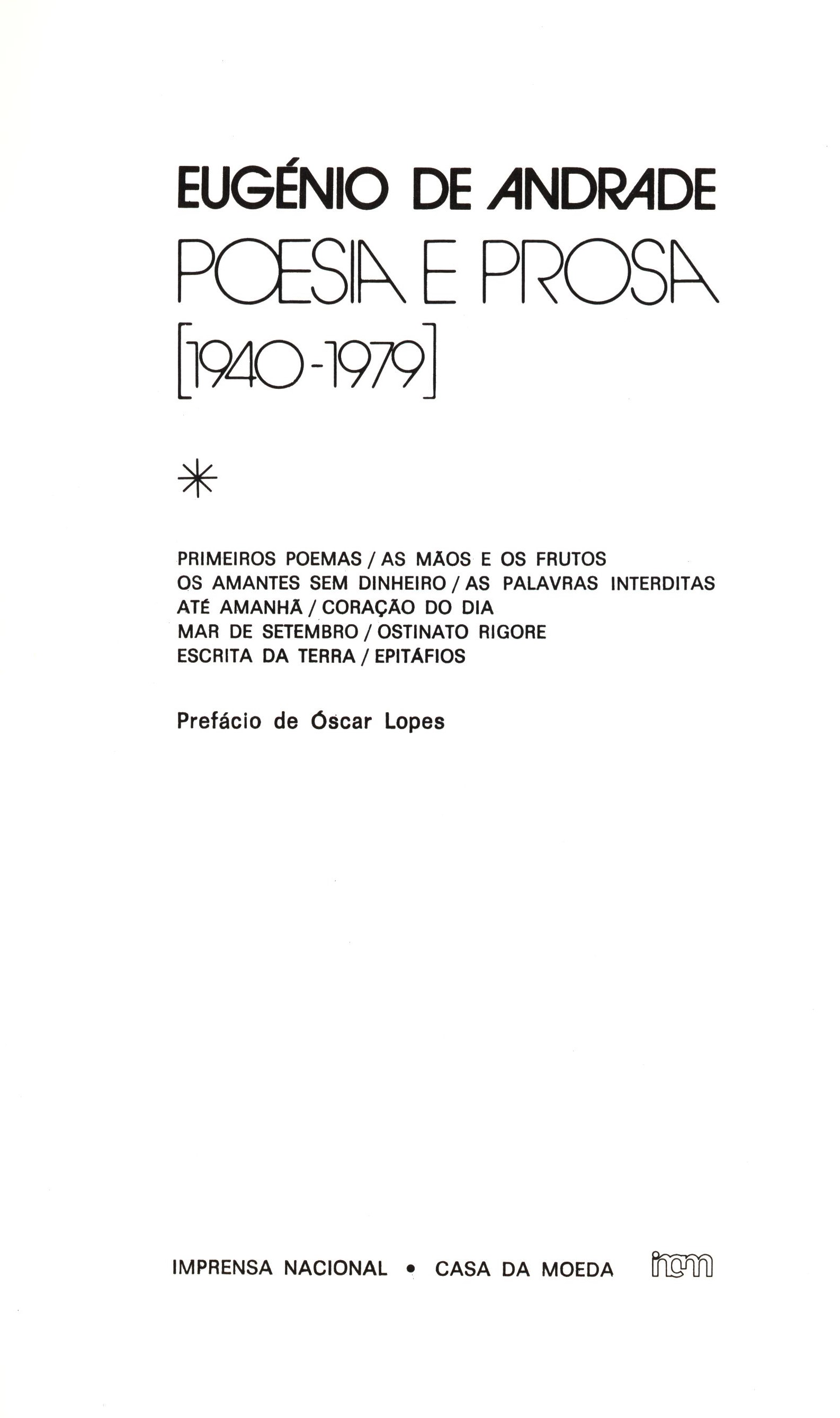 Názvové údaje Poesia e prosa : [1940–1979] / Eugénio de Andrade ; prefácio de Óscar Lopes Osobní jméno Andrade, Eugénio de, 1923-2005 (Autor) Další autoři Lopes, Óscar (Autor úvodu atd.) Korp. Imprensa Nacional-Casa da Moeda (Nakladatel, vydavatel) Gráfica Maiadouro (Tiskař) Nakladatel [Vila da Maia] : Imprensa Nacional-Casa da Moeda, [1980] Výrobce Gráfica Maiadouro Rozsah 283 stran : čb. ilustrace ; 25 cm ISBN (Vázáno) Země vyd. Portugalsko Jazyk dok. portugalština Poznámky Zdobená obálka. - Čb. ilustrace. - Předmluva