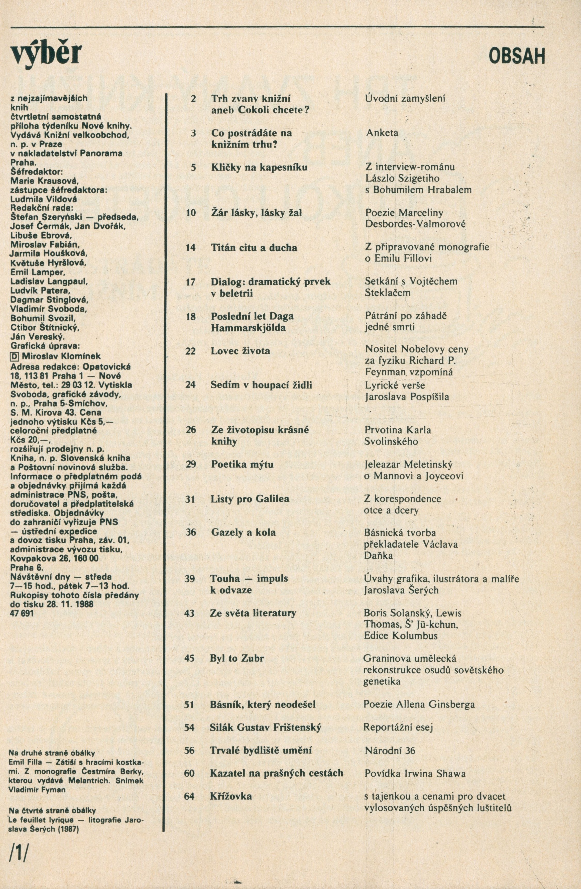 Názvové údaje Výběr z nejzajímavějších knih : čtvrtletní samostatná příloha týdeníku Nové knihy. 1, 1989 / šéfredaktor: Marie Krausová ; grafická úprava Miroslav Klomínek Další autoři Krausová, Marie (Šéfredaktor, odpovědný redaktor) Klomínek, Miroslav, 1931- (Knižní grafik) Korp. Panorama (nakladatelství a vydavatelství) (Nakladatel, vydavatel) Knižní velkoobchod (vydavatelství a distribuce) (Nakladatel, vydavatel) Svoboda (tiskárna) (Tiskař) Nakladatel V Praze : Panorama, 1989 Výrobce Praha : Svoboda, grafické závody, n.p. Rozsah 64 stran : ilustrace ; 29,5 cm ISBN (Brožováno) Země vyd. Česko Jazyk dok. čeština Anotace Propagační a informační magazín (od druhého ročníku čtvrtletník) vydával Knižní velkoobchod v nakladatelství Orbis (od 1976 Panorama). Časopis řídila redakční rada. Obsah časopisu tvořily převážně ukázky z knih připravovaných k vydání ve státních nakladatelstvích. Šlo o knihy domácích i zahraničních autorů, a to jak o beletrii, tak i o literaturu faktu, dokumentární žánry a populárněvědné publikace. Ukázky byly obvykle uvedeny krátkou informací o autorovi. Příspěvků psaných přímo pro časopis bylo v každém čísle jen několik. Většinou to byly drobné fejetony, autorská vyznání, vzpomínkové články a úvahy, rozhovory se spisovateli, výtvarníky a jinými umělci, odpovědi na anketní otázky, anotace připravovaných knih v rubrikách Co píší naši spisovatelé, Výběr radí čtenářům a Nasbíráno v nakladatelstvích, popř. články o konkrétních knihách nebo autorech. V závěrečné části časopisu vycházely horoskopy, výňatky ze snářů, recepty, kvízy a křížovky apod. Značnou část obsahu tvořily celostránkové inzeráty na knižní produkci jednotlivých nakladatelství. Druh dok. monografie Klíčová slova česká literatura * čtvrtletník * výběr * knihy * úvahy * zamyšlení * tipy * zajímavosti * rozhovory * korespondence * texty * ankety * Československo * r. 1989 MDT 82-4 * 002 * 82-83 * 82-6 * (044) * (437) * 821.162.3 Uživatelské pole PNP Kniha se sign. LITd 0364 - pozůstalost Pelušky Bendlové. Signatura Přír.číslo Lokace Info LITd 0364 0222/2026 Sbírka