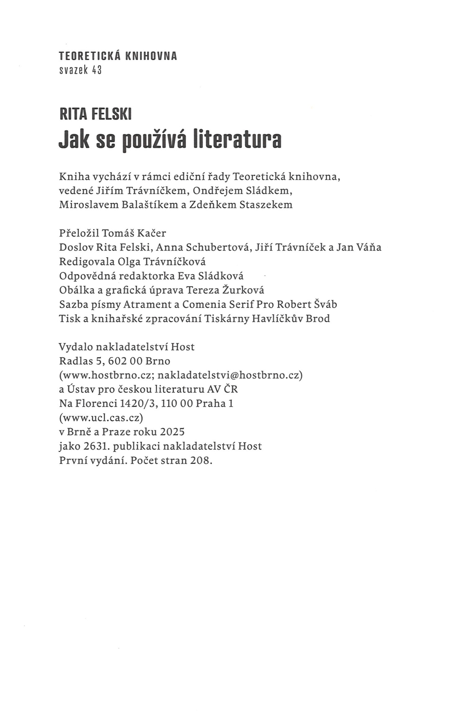 1. Názvové údajeJak se používá literatura / Rita Felski ; přeložil Tomáš Kačer ; obálka a grafická úprava Tereza Žurková