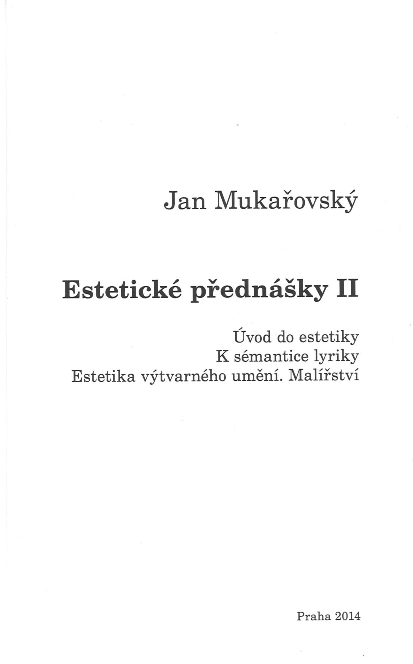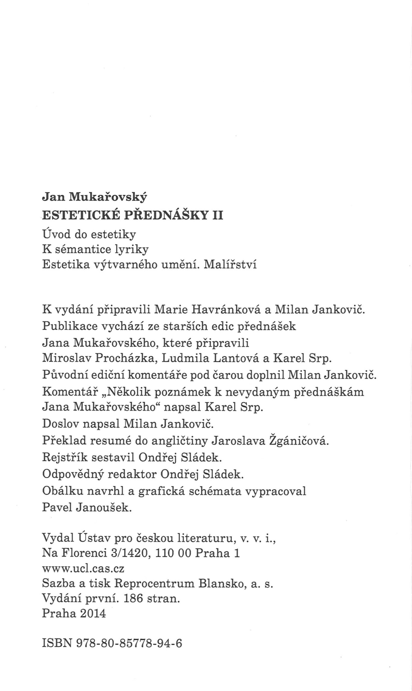 Názvové údaje Estetické přednášky II : Úvod do estetiky ; K sémantice lyriky ; Estetika výtvarného umění. Malířství / Jan Mukařovský ; k vydání připravili Marie Havránková a Milan Jankovič ; původní ediční komentáře pod čarou doplnil [a] doslov napsal Milan Jankovič ; obálku navrhl a grafická schémata vypracoval Pavel Janoušek Osobní jméno Mukařovský, Jan, 1891-1975 (Autor) Další autoři Jankovič, Milan, 1929-2019 (Editor) (waw) (wac) Havránková, Marie, 1949- (Editor) Janoušek, Pavel, 1956- (Knižní grafik) (Autor obálky) Korp. Ústav pro českou literaturu (Akademie věd ČR) (Nakladatel, vydavatel) Tiskárna Reprocentrum (Tiskař) Další var.názvy Úvod do estetiky K sémantice lyriky Estetika výtvarného umění Údaje o vydání Vydání první Nakladatel Praha : Ústav pro českou literaturu AV ČR, v.v.i., 2014 Výrobce [Blansko] : Reprocentrum Blansko, a.s. Rozsah 184 stran : grafy ; 20 cm ISBN 978-80-85778-94-6 (brožováno) Země vyd. Česko Jazyk dok. čeština Poznámky Publikace vychází ze starších edic přednášek Jana Mukařovského, které připravili Miroslav Procházka, Ludmila Lantová a Karel Srp.
