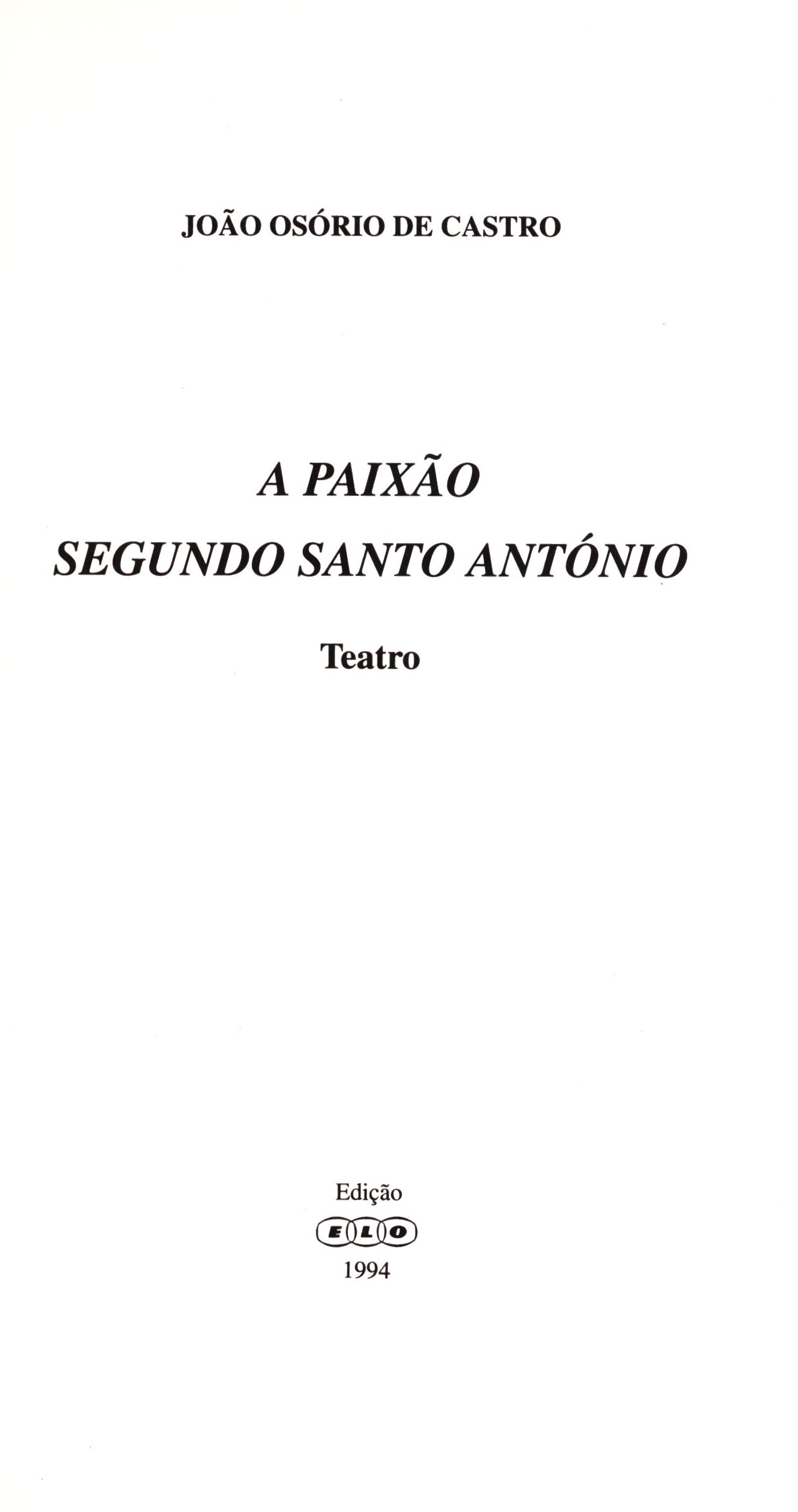 Názvové údaje A paixão segundo santo António : teatro / João Osório de Castro Osobní jméno Castro, João Osório de (Autor) Další autoři Edição ELO (Nakladatel, vydavatel) ELO – Publicidade, Artes Gráficas, Lda. (Tiskař) Nakladatel [místo vydání není známé] : Edição ELO, 1994 Výrobce ELO – Publicidade, Artes Gráficas, Lda. Rozsah 62 stran ; 24 cm ISBN 972-9181-29-2 (brožováno) Země vyd. Portugalsko Jazyk dok. portugalština Poznámky Zdobená obálka. - Úvod