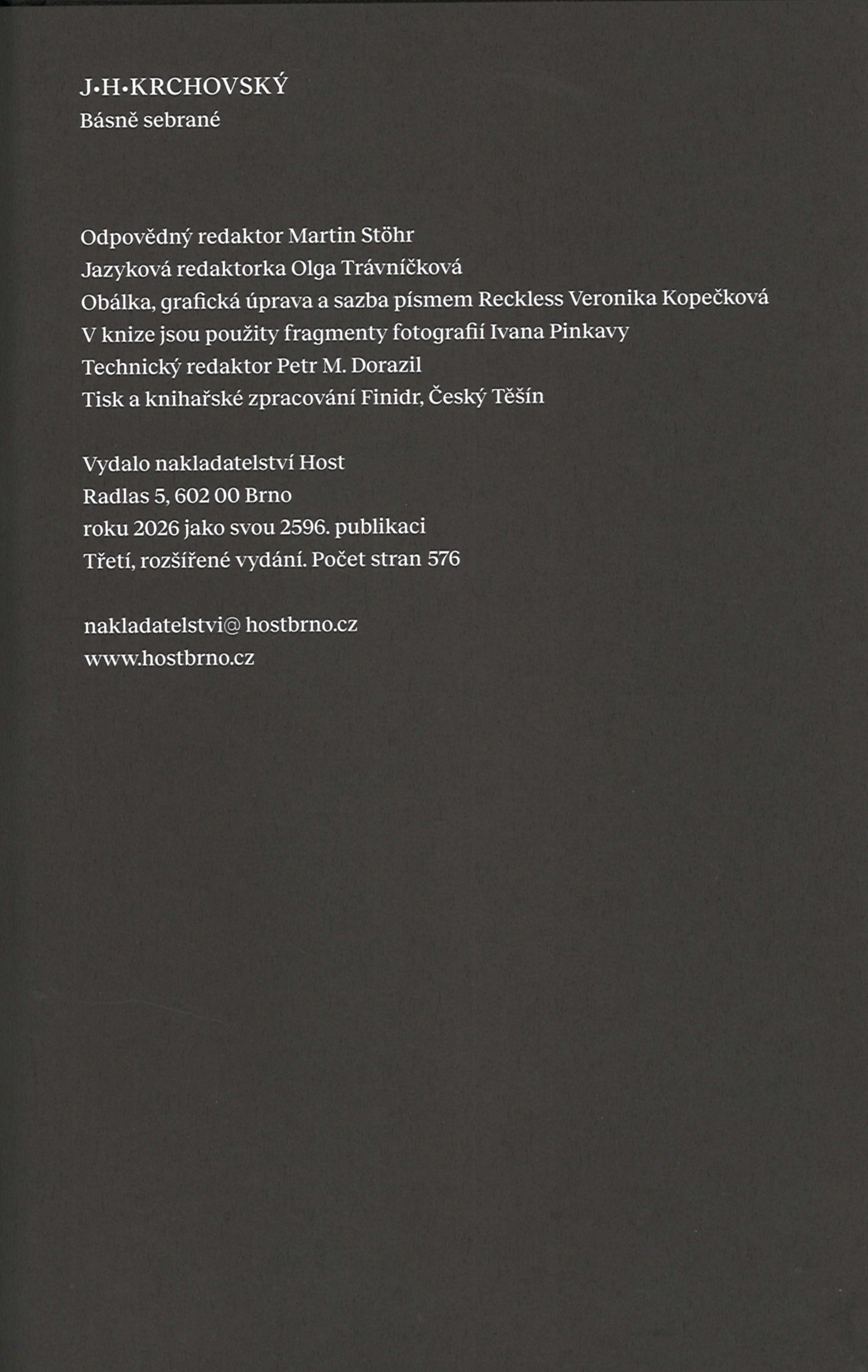 Názvové údaje Básně sebrané / J.H. Krchovský ; obálka, grafická úprava a sazba ... Veronika Kopečková Osobní jméno Krchovský, J. H., 1960- (Autor) Další autoři Kopečková, Veronika, 1977- (Výtvarník vazby) (Knižní grafik) (Sazeč) Korp. Host (nakladatelství) (Nakladatel, vydavatel) Finidr (tiskárna) (Tiskař) Údaje o vydání Třetí, rozšířené vydání Nakladatel Brno : Host, 2026 Výrobce Český Těšín : Finidr Rozsah 569 stran ; 21 cm ISBN 978-80-275-2672-7 (vázáno) Země vyd. Česko Jazyk dok. čeština Poznámky Zdobená kartonová vazba imitující plátno, se zlacením, bez přebalu. - V knize jsou použity fragmenty fotografií Ivana Pinkavy. - Bílý tisk na černém podkladu