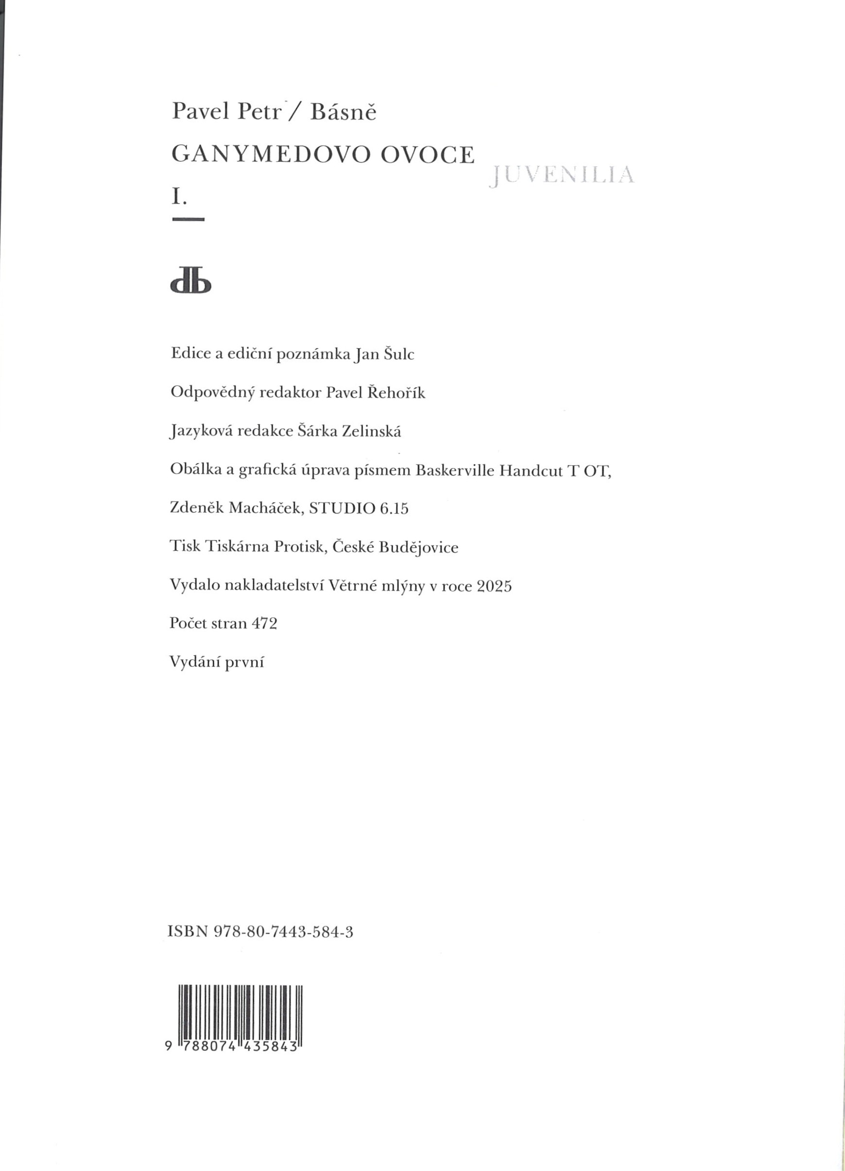 Názvové údaje Básně. I, Ganymedovo ovoce : juvenilia / Pavel Petr ; edice a ediční poznámka Jan Šulc ; obálka a grafická úprava ... Zdeněk Macháček Osobní jméno Petr, Pavel, 1969- (Autor) Další autoři Šulc, Jan, 1965- (Editor) (wac) Macháček, Zdeněk, 1960- (Autor obálky) (Knižní grafik) Korp. Větrné mlýny (nakladatelství) (Nakladatel, vydavatel) Protisk (tiskárna, České Budějovice) (Tiskař) Údaje o vydání Vydání první Nakladatel [Brno] : Větrné mlýny, 2025 Výrobce České Budějovice : Protisk Rozsah 471 stran ; 22 cm ISBN 978-80-7443-584-3 (vázáno) Země vyd. Česko Jazyk dok. čeština Poznámky Černá celoplátěná vazba s přebalem a tiskem. - Rozložený litulní list. - Autorské poznámky. - Ediční poznámka. - Biografie a bibliografie autora