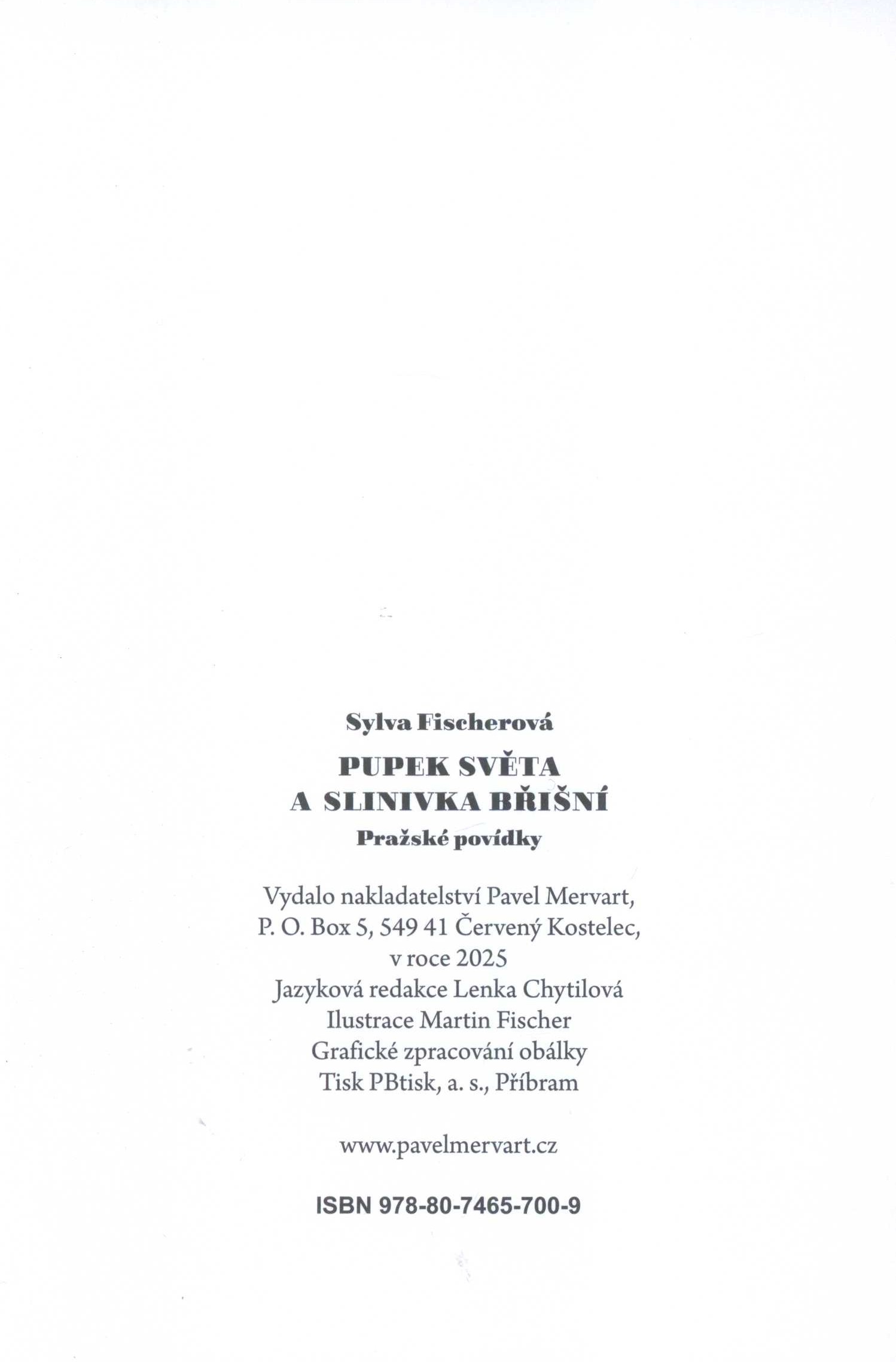 Názvové údaje Pupek světa a slinivka břišní : pražské povídky / Sylva Fischerová ; ilustrace Martin Fischer Osobní jméno Fischerová, Sylva, 1963- (Autor) Další autoři Fischer, Martin (Ilustrátor) Korp. Nakladatelství Pavel Mervart (Nakladatel, vydavatel) PBtisk (tiskárna) (Tiskař) Nakladatel Červený Kostelec : Pavel Mervart, 2025 Výrobce Příbram : PBtisk, a.s. Rozsah 233 stran : ilustrace ; 21 cm ISBN 978-80-7465-700-9 (vázáno) Země vyd. Česko Jazyk dok. čeština Poznámky Zdobená barevná obálka. - Černobílé celostránkové ilustrace. - Ediční poznámka. - Obsah. - Na zadní straně obálky anotace knihy.
