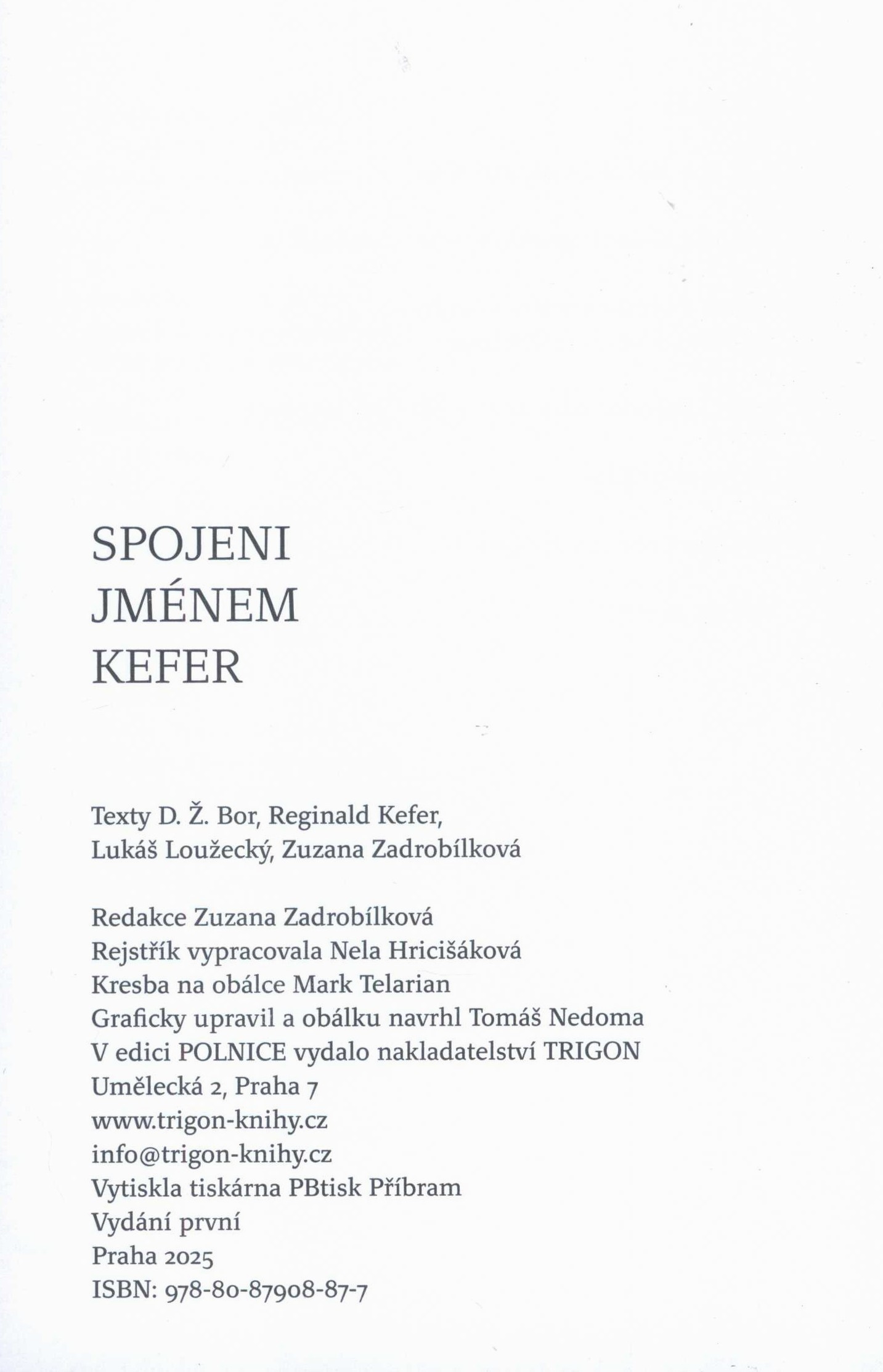 1. Názvové údajeSpojeni jménem Kefer / texty D.Ž. Bor, Reginald Kefer, Lukáš Loužecký, Zuzana Zadrobílková ; kresba na obálce Mark Telarian ; graficky upravil a obálku navrhl Tomáš Nedoma