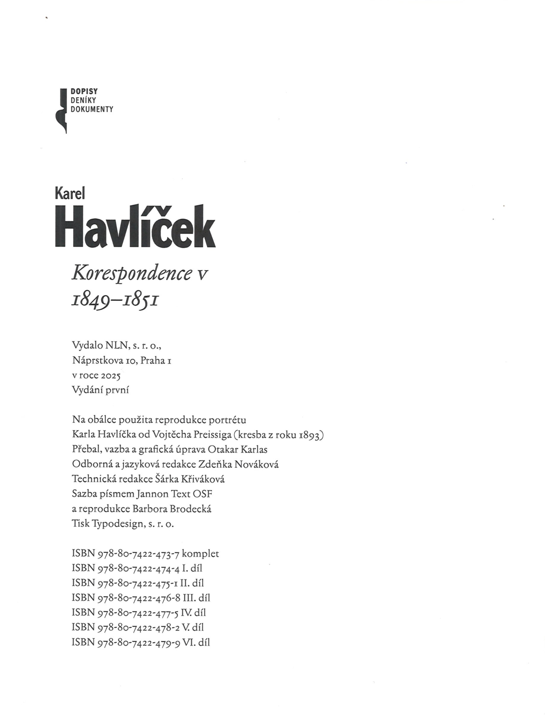 Názvové údaje Korespondence. V, 1849-1851 / Karel Havlíček ; přebal, vazba a grafická úprava Otakar Karlas Osobní jméno Havlíček Borovský, Karel, 1821-1856 (Autor) (Adresát, příjemce) (Korespondent) Další autoři Karlas, Otakar, 1956- (Autor obálky) (Výtvarník vazby) (Knižní grafik) Pokorná, Magdaléna, 1961- (Editor) (wpr) Korp. Lidové noviny (nakladatelství) (Nakladatel, vydavatel) Typodesign (firma) (Tiskař) Údaje o vydání Vydání první Nakladatel Praha : NLN, 2025 Výrobce [České Budějovice] : Typodesign, s.r.o. Rozsah 481 stran : ilustrace, portréty, faksimile ; 22 cm ISBN 978-80-7422-473-7 (komplet ; vázáno) 978-80-7422-478-2 (V. díl ; vázáno) Edice Dopisy, deníky, dokumenty