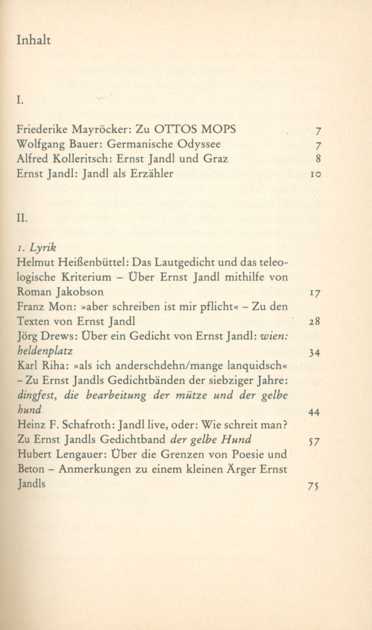 AnotaceKniha obsahuje kritické texty, rozbory lyriky, eseje a dokumentaci k dílu rakouského básníka Ernsta Jandla, včetně obsáhlé bibliografie. Představuje důležitý sekundární zdroj pro studium Jandlovy experimentální poezie.