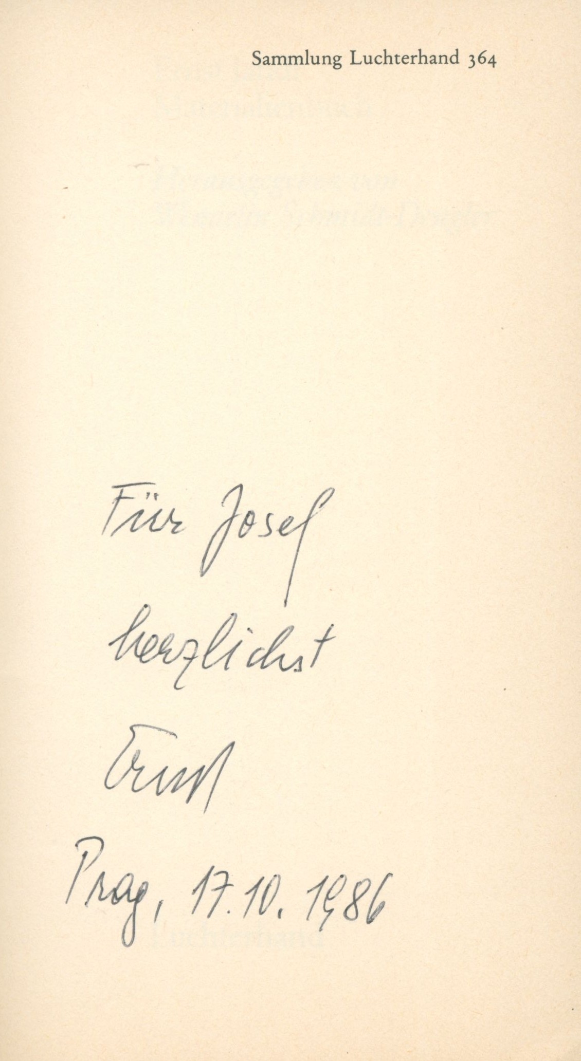 Uživatelské pole PNPV knize se sign. H&G 0141 - na vakátě ručně psaná dedikace autora Josefovi (Hiršalovi) s podpisem Ernst a datací Prag, 17.10. 1986.