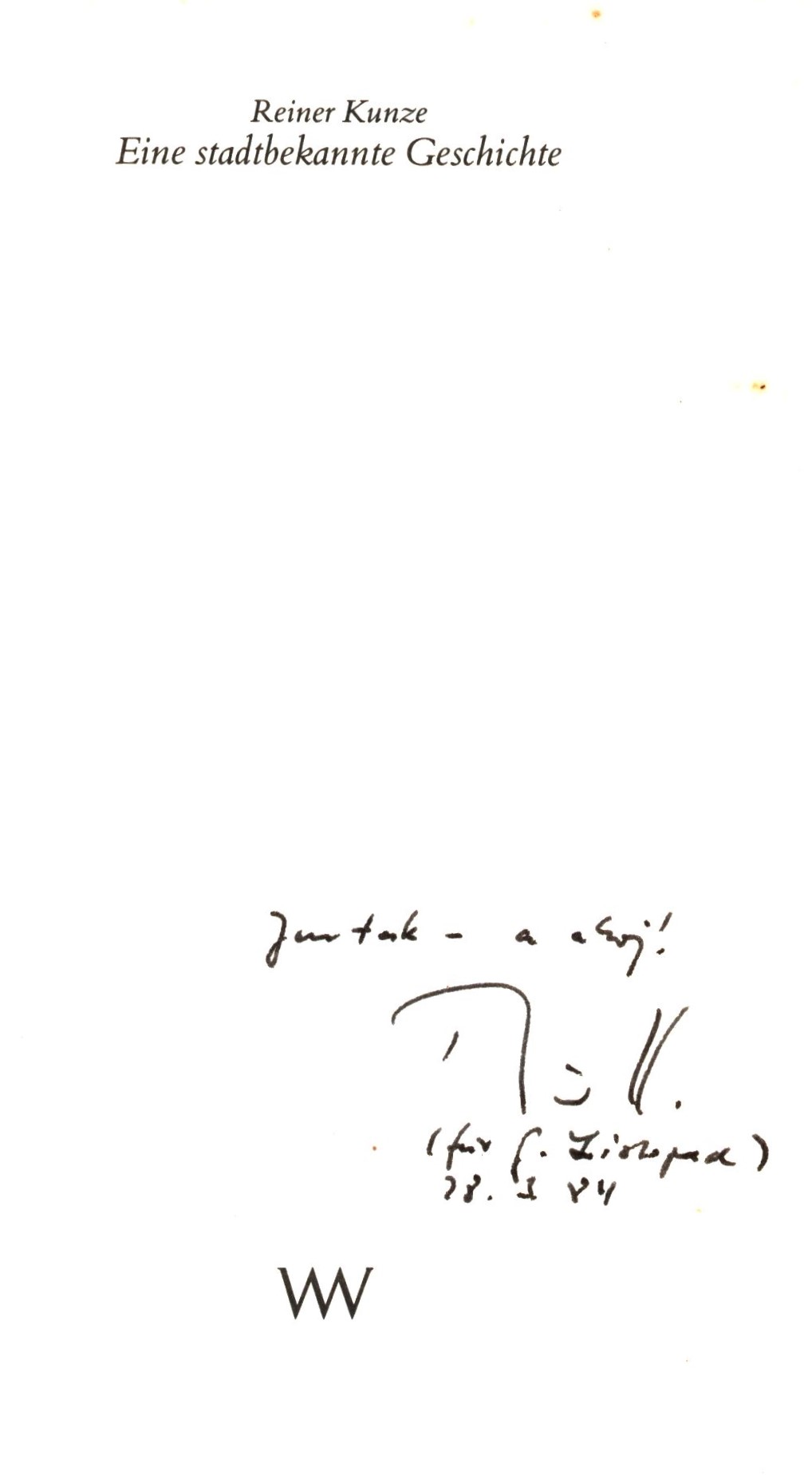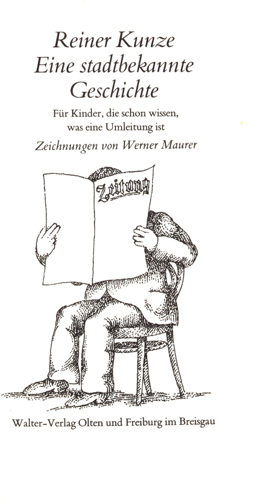 Názvové údaje Eine stadtbekannte Geschichte : für Kinder, die schon wissen, was eine Umleitung ist / Reiner Kunze ; Zeichnungen von Werner Maurer Osobní jméno Kunze, Reiner, 1933- (Autor) Další autoři Maurer, Werner (Ilustrátor) Korp. Walter-Verlag (Nakladatel, vydavatel) Nakladatel Olten : Walter-Verlag, [1982] Copyright ©1982 Rozsah 61 stran : čb. ilustrace ; 18 cm ISBN 3-530-49470-4 (brožováno) Země vyd. Švýcarsko Jazyk dok. němčina Poznámky Zdobená obálka. - Čb. ilustrace