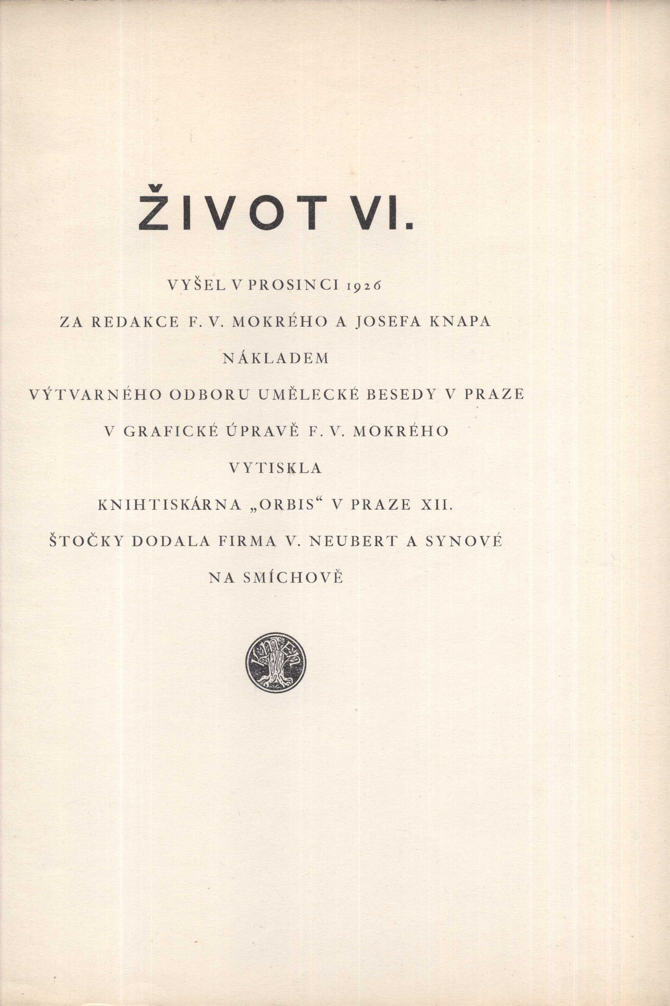 Názvové údaje Život : výtvarný a literární sborník Záhlaví-korpor. Výtvarný odbor Umělecké besedy (Praha) (Autor) (Nakladatel, vydavatel) Další autoři Mokrý, František Viktor, 1892-1975 (Sestavovatel, kompilátor) (Knižní grafik) Knap, Josef, 1900-1973 (Sestavovatel, kompilátor) Vořechová-Vejvodová, Marie, 1889-1974 (Ilustrátor) Sedláček, Vojtěch, 1892-1973 (Grafický technik) (Iluminátor) Korp. Orbis (tiskárna) (Tiskař) V. Neubert a synové (firma) (Jiná role) Roč., číslo Svazek šestý, 1927 Nakladatel V Praze : nákladem Výtvarného odboru Umělecké besedy, 1927 Výrobce Knihtiskárna "Orbis" Rozsah 59 stran, 48 nečíslovaných stran obrazové přílohy : ilustrace ; 29,5 cm + 3 nečíslované listy grafické přílohy ISBN Brožováno Země vyd. Česko Jazyk dok. čeština Poznámky V tiráži odlišné datum vydání: "Vyšel v prosinci 1926".
