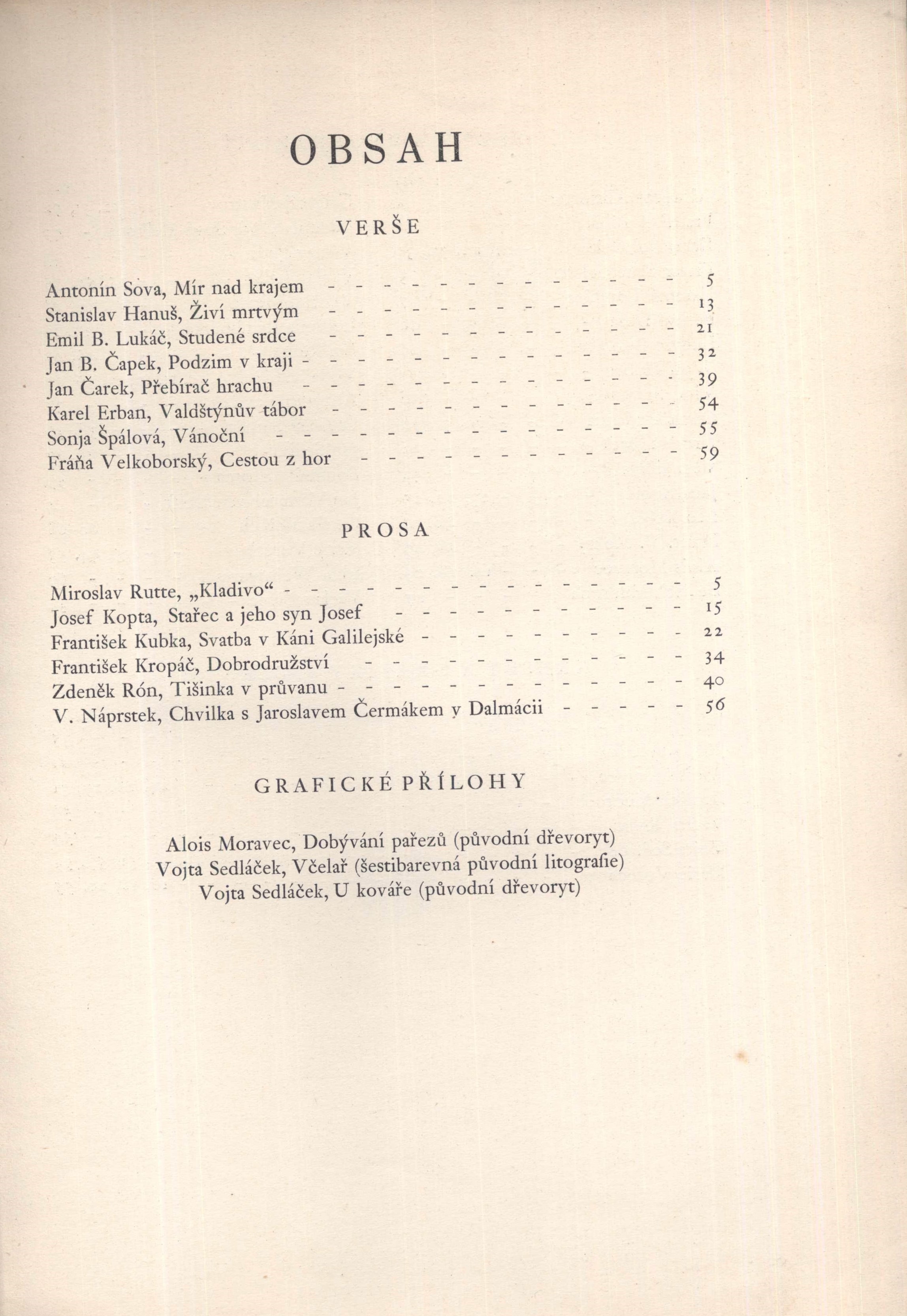Zdobená obálka. - Černobílé ilustrace. - 48 stran obrazové přílohy na křídovém papíru. - 3 listy grafické přílohy (1x Moravec, 2x Sedláček). - Za tiráží ještě 12 stran reklamní přílohy spojené s rubrikou Z kroniky Výtvarného odboru a 1 list reklamy na barevném papíře.