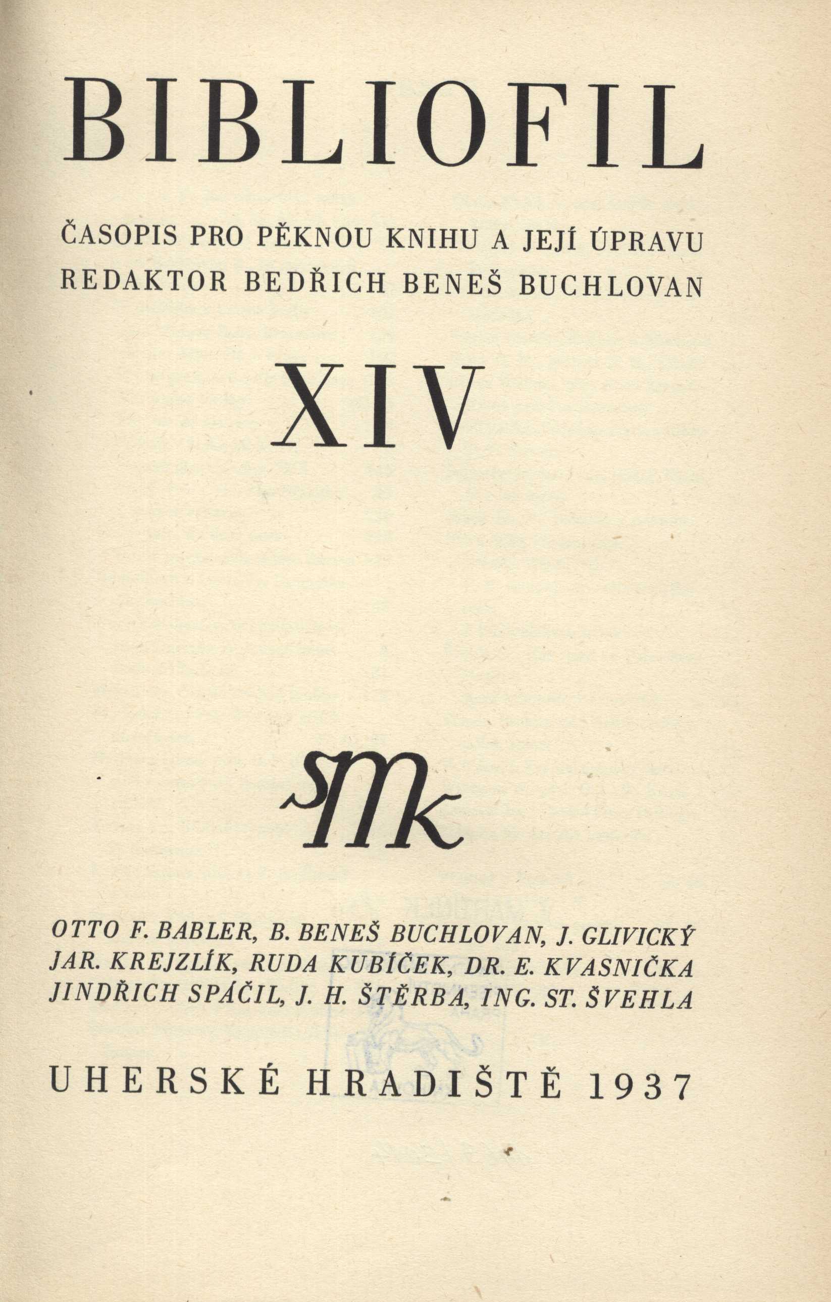 Názvové údaje Bibliofil : časopis pro pěknou knihu a její úpravu Další autoři Beneš Buchlovan, Bedřich, 1885-1953 (Editor) Korp. Skupina moravských knihomilů (Nakladatel, vydavatel) Kryl a Scotti (firma) (prt (Nový Jičín, Česko)) Roč., číslo ročník 14, číslo 1-10, 1937 Nakladatel Uherské Hradiště : Skupina moravských knihomilů, 1937 Výrobce Kryl a Scotti) Rozsah [31] l. obr. příl., il. 183 s. Země vyd. Česko Jazyk dok. čeština Poznámky Na frontispisu F.B. Kouba: Dřevoryt pro novoročenku BBB. - Černobílé ilustrace v textu. - Na přílohách převážně černobílé ilustrace, knižní ilustrace, dřevoryty, fotografie a exlibris. - Obsahuje bibliografie, bibliografické odkazy a bibliografické informace
