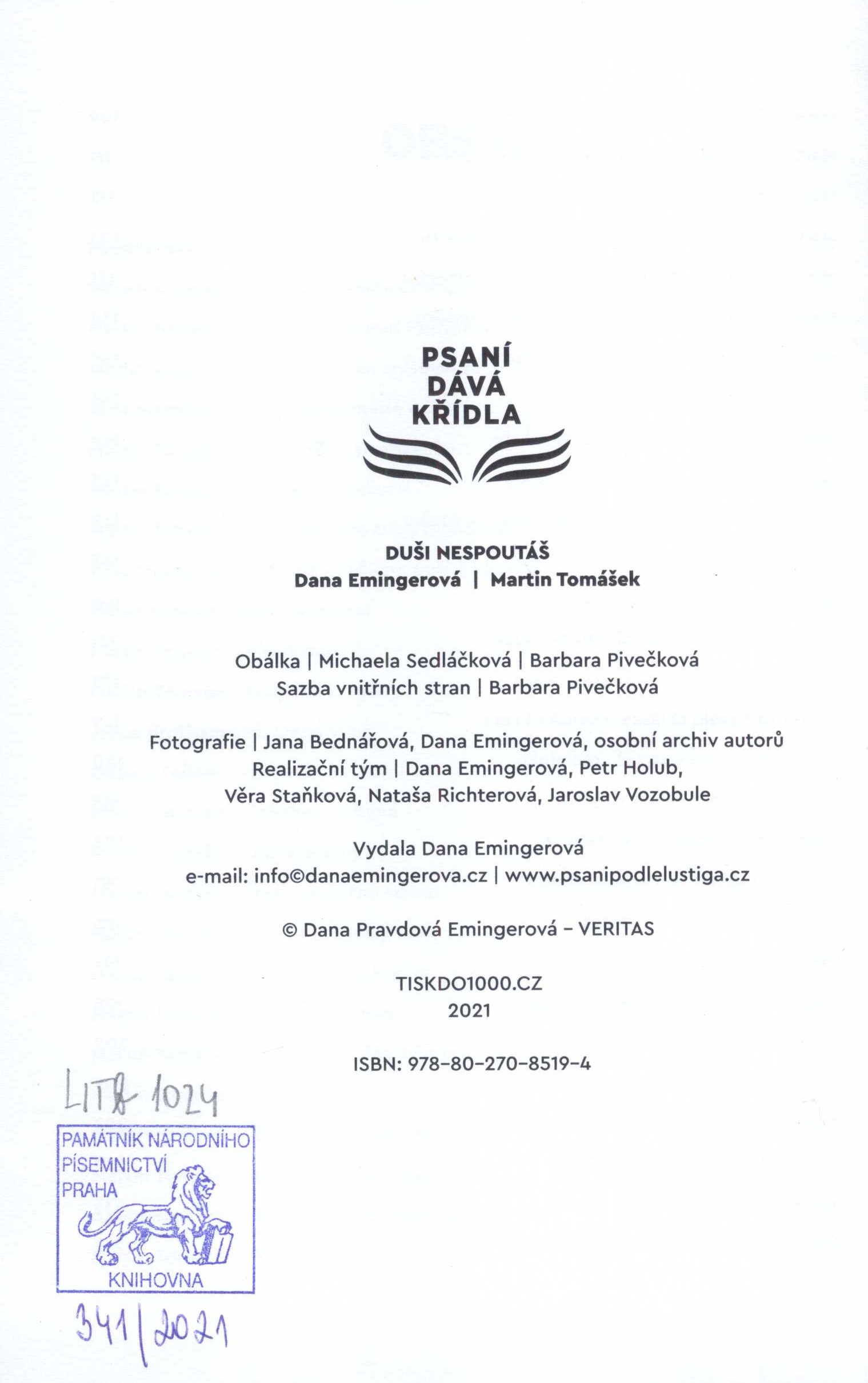 1. Názvové údajeDuši nespoutáš / Dana Emingerová, Martin Tomášek ; obálka Michaela Sedláčková, Barbara Pivečková