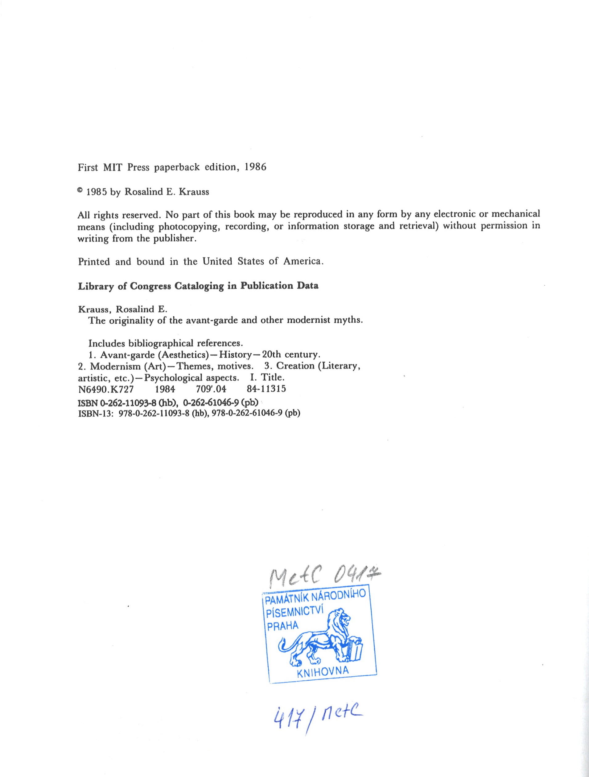 Názvové údaje The originality of the avant-garde and other modernist myths / Rosalind E. Krauss Osobní jméno Krauss, Rosalind E., 1940- (Autor) Další autoři MIT Press (Nakladatel, vydavatel) Údaje o vydání First Mit Press paperback edition Nakladatel Cambridge, Massachusetts ; London : The Mit Press, 1986 Rozsah 307 stran : ilustrace ; 23 cm ISBN 0-262-61046-9 (brožováno) Země vyd. Spojené státy americké Jazyk dok. angličtina Poznámky Zdobená obálka s fotografií. - Úvod. - Černobílé reprodukce a fotografie. - Tiráž na rubu titulního listu. - Na zadní straně obálky anotace