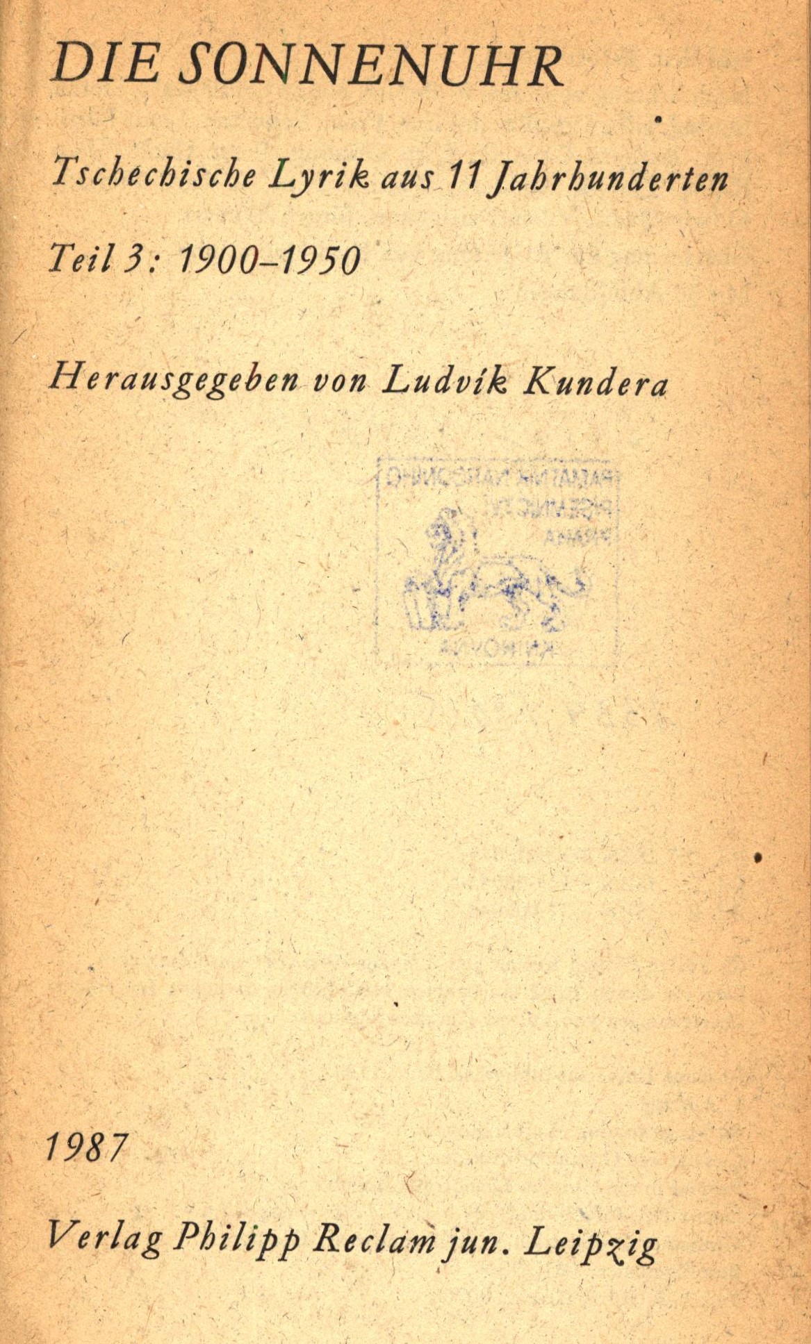 Reclams Universal-Bibliothek. Belletristik (Philipp Reclam jun.)Země vyd. Německo Jazyk dok. němčina Jazyk orig. čeština Poznámky "Den für diesen Band erarbeiteten Nachdichtungen liegen Interlinearübersetzungen von Ludvík Kundera zugrunde"--Rub titulní stránky