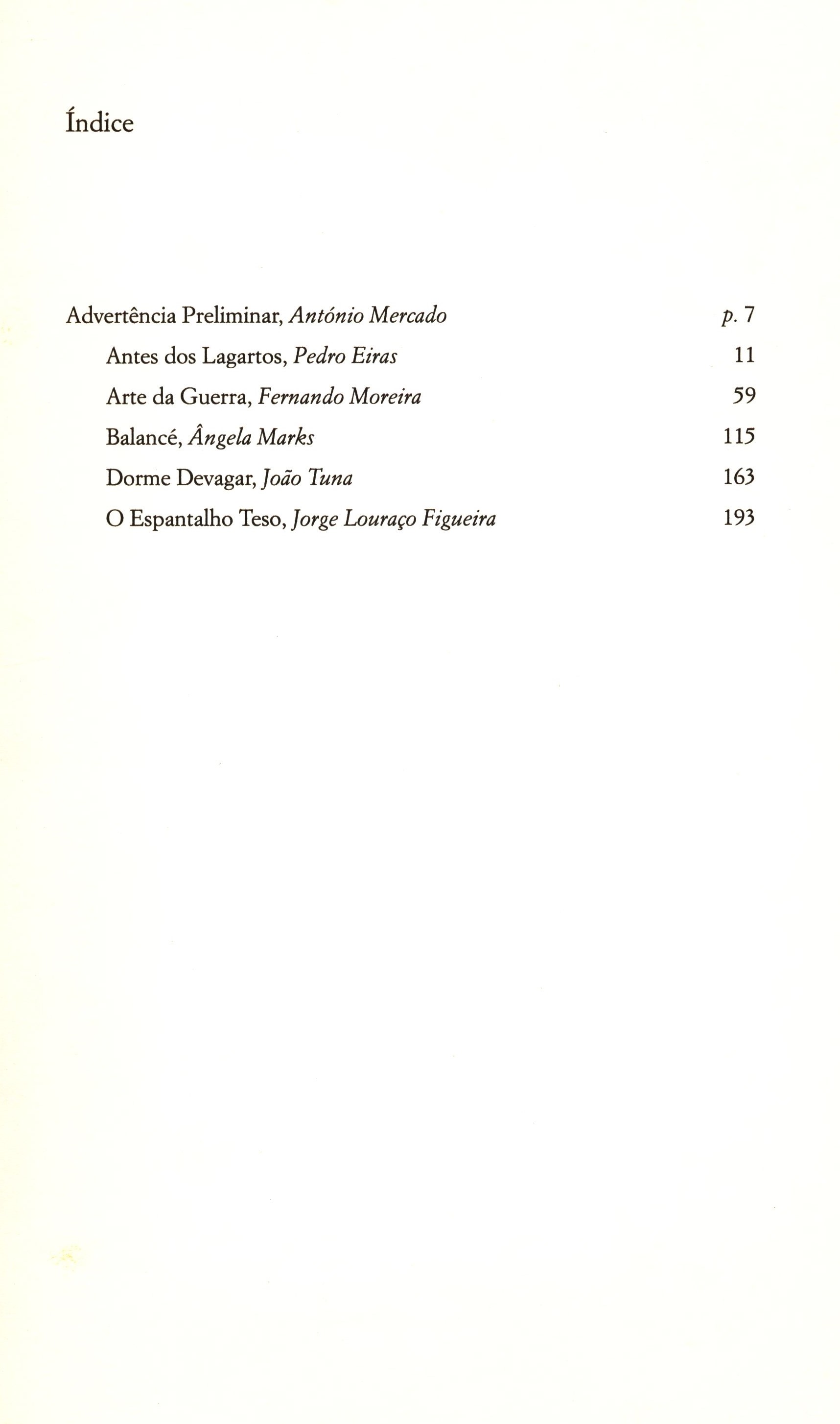 Antes dos Lagartos, Arte da Guerra, Balancé, Dorme Devagar, O Espantalho Teso