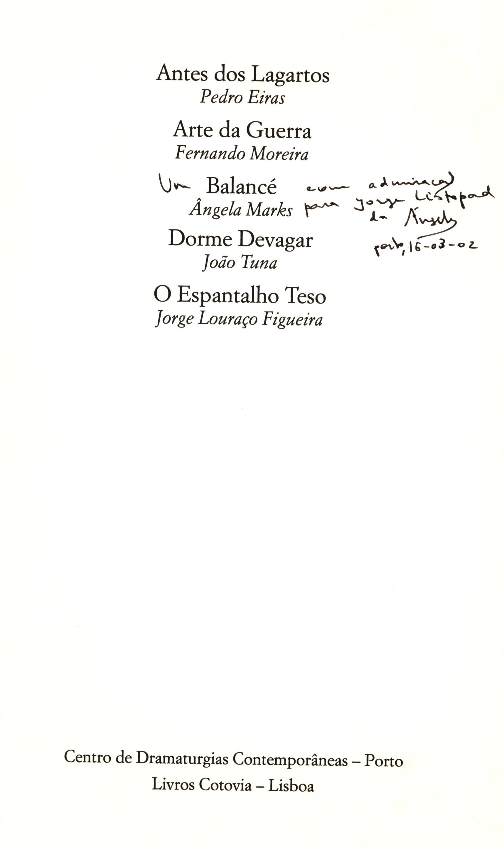 Názvové údaje Antes dos Lagartos, Arte da Guerra, Balancé, Dorme Devagar, O Espantalho Teso / Pedro Eiras ; Fernando Moreira ; Ângela Marks ; João Tuna ; Jorge Louraço Figueira Osobní jméno Eiras, Pedro, 1975- (Autor) Další autoři Moreira, Fernando (Autor) Marks, Ângela (Autor) Tuna, João (Autor) Louraço Figueira, Jorge (Autor) Korp. Cotovia (nakladatelství) (Nakladatel, vydavatel) Tipografia Guerra (Tiskař) Nakladatel Lisabon : Cotovia, ©2001 Výrobce Viseu : Tipografia Guerra, Rozsah 232 stran ; 26 cm ISBN 972-795-016-7 (brožováno) Edice Cadernos Dramat, 5
