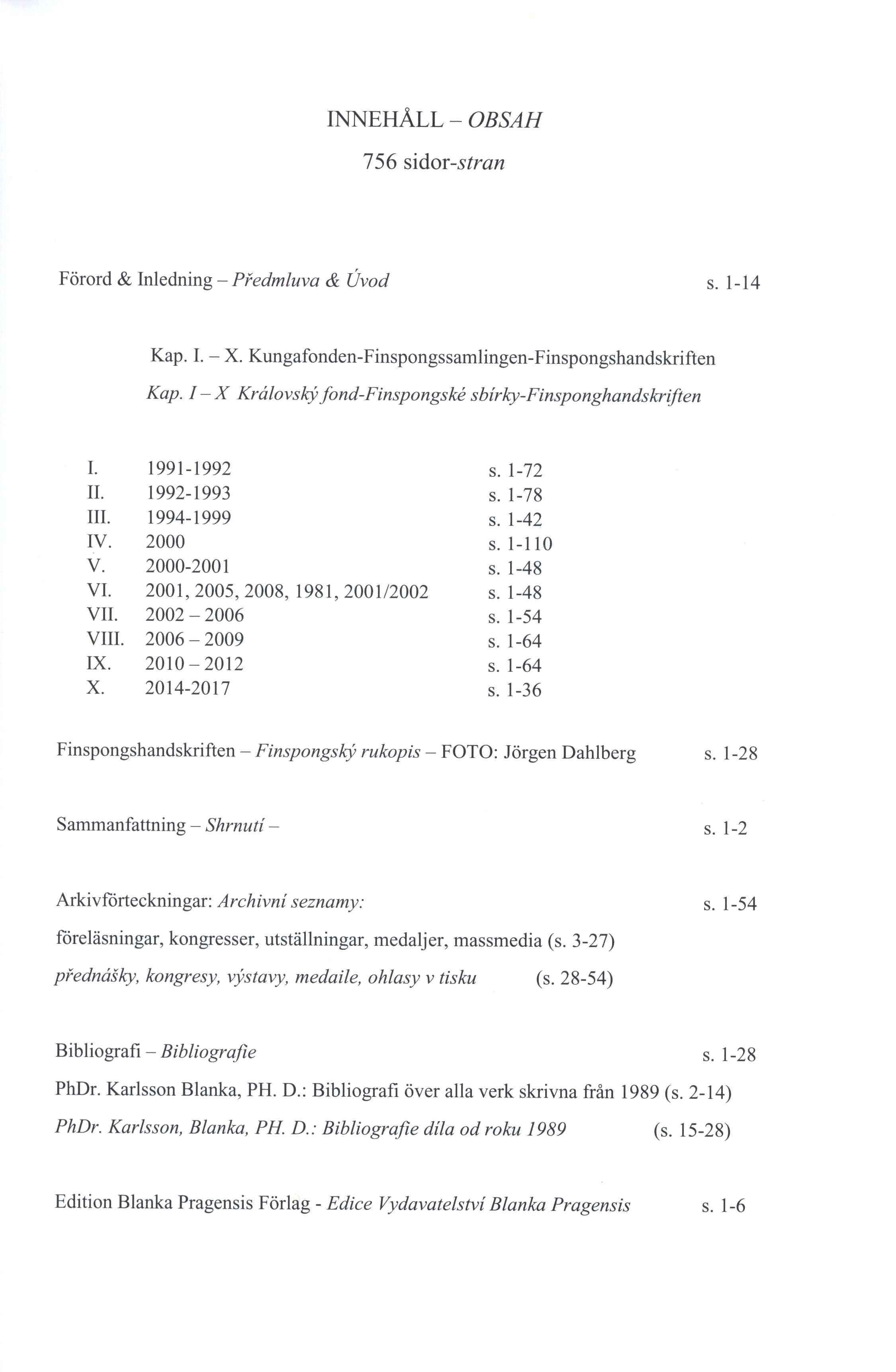Limited edition. Publikationsserie, (Blanka Pragensis Förlag)Země vyd. Švédsko Jazyk dok. švédština * čeština Jazyk orig. švédština Poznámky Bílá vazba s modrým textem a tónovanými fotografiemi částí rukopisu. - Titulní list s tónovanými fotografiemi částí rukopisu. - Údaje tiráže. - Patitul, nakladatelská značka. - Obsah. - Předmluva a úvod autorky, barevné fotografie s popisky. - Barevné a černobílé fotografie, ilustrace, faksimile s popisky. - Edice Vydavatelství Blanka Pragensis Förlag. - Tiráž. - Barevné foto autorky a její stručná biografie na zadní straně vazby.