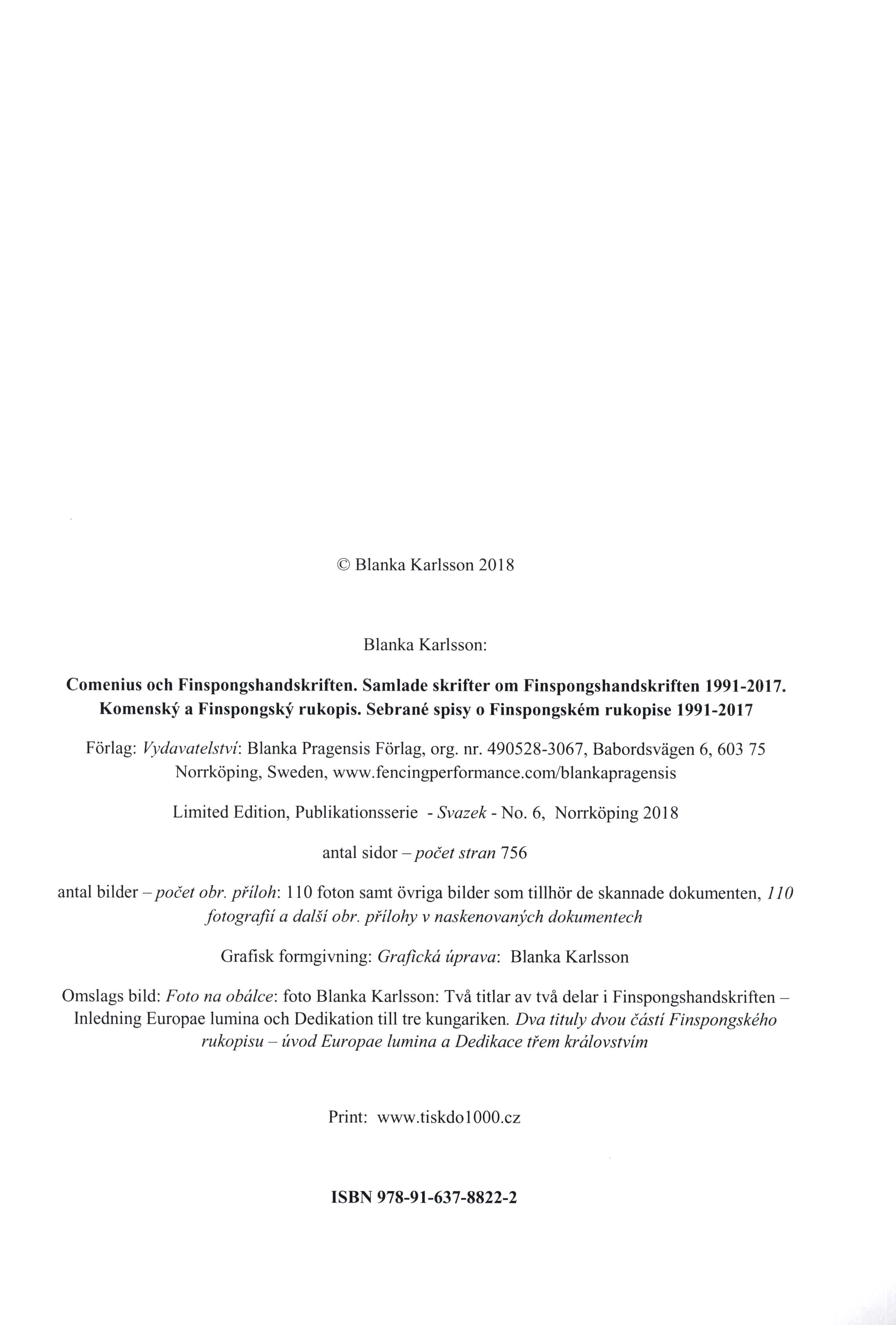 Názvové údaje Comenius och Finspongshandskriften : samlade verk om Finspongshandskriften 1991-2017 = Komenský a Finspongský rukopis : sebrané spisy o Finspongském rukopise 1997-2017 / Blanka Karlsson ; grafisk formgivning Blanka Karlsson ; omslags bild Blanka Karlsson Osobní jméno Karlsson, Blanka, 1949- (Autor) (Knižní grafik) (Fotograf) (Nakladatel, vydavatel) Další autoři Blanka Pragensis Förlag (nakladatelství a vydavatelství) (Nakladatel, vydavatel) Tisk Do 1000 (tiskárna) (Tiskař) Nakladatel Norrköping : Blanka Pragensis Förlag, 2018 Výrobce Praha : TiskDo1000.cz Rozsah 750 stran v různém stránkování : ilustrace (některé barevné), portréty, faksimile ; 31 cm + errata (3 strany) ISBN 978-91-637-8822-2 (vázáno) Edice Limited edition. Publikationsserie ; no. 6