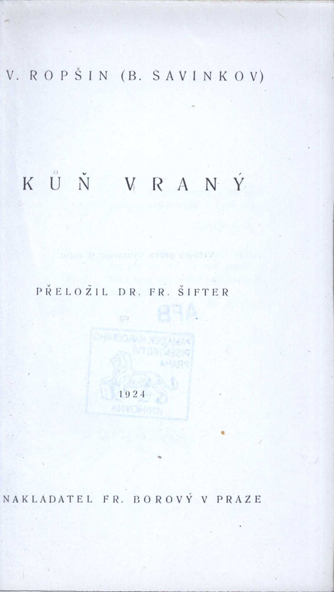 Názvové údaje Kůň vraný / V. Ropšin (B. Savinkov) ; přeložil Fr. Šifter Osobní jméno Savinkov, Boris Viktorovič, 1879-1925 (Autor) Další autoři Šifter, František, 1888-1928 (Překladatel) Korp. Fr. Borový (firma) (Nakladatel, vydavatel) Polygrafia (nakladatelství a tiskárna, Brno) (Tiskař) Nakladatel V Praze : Fr. Borový, 1924 Výrobce Polygrafie) Rozsah 126 s. ISBN brož. Edice Edice Června sv. 35