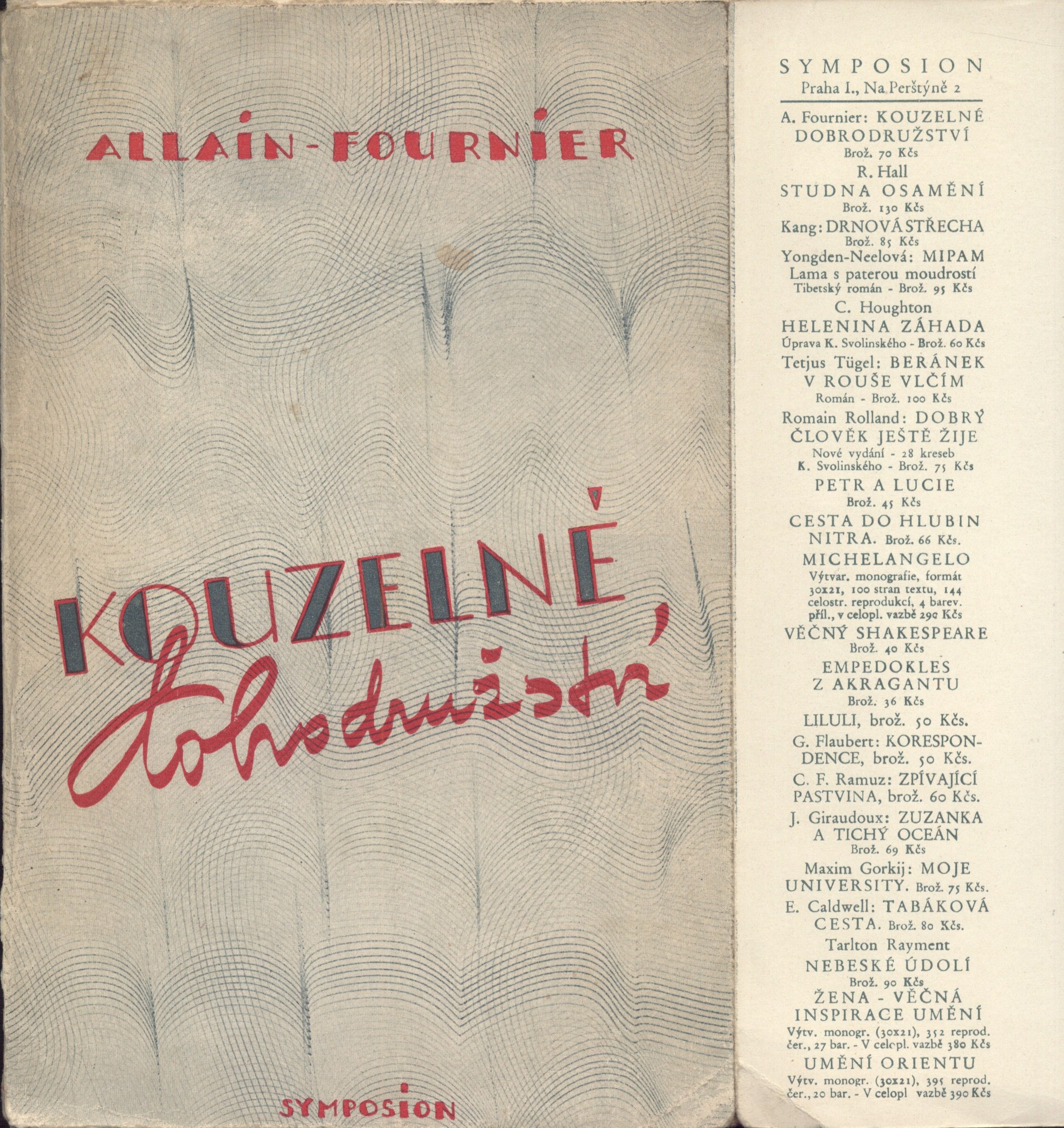 Názvové údaje Kouzelné dobrodružství : (Veliký Meaulnes) : román / Alain-Fournier ; z francouzštiny přeložil Jaroslav Zaorálek Autor Alain-Fournier, 1886-1914 (Autor) Další autoři Zaorálek, Jaroslav, 1896-1947 (Překladatel) Martin, Ivan (Autor obálky) (Výtvarník vazby) Korp. Rudolf Škeřík (nakladatelství) (Nakladatel, vydavatel) Státní tiskárna v Praze (Tiskař) Další var.názvy Veliký Meaulnes Údaje o vydání II. vydání Nakladatel Praha : Symposion, Rudolf Škeřík, 1948 Výrobce Státní tiskárna Rozsah 234 stran ; 21 cm ISBN (Brožováno) Edice Symposion ; 33. svazek