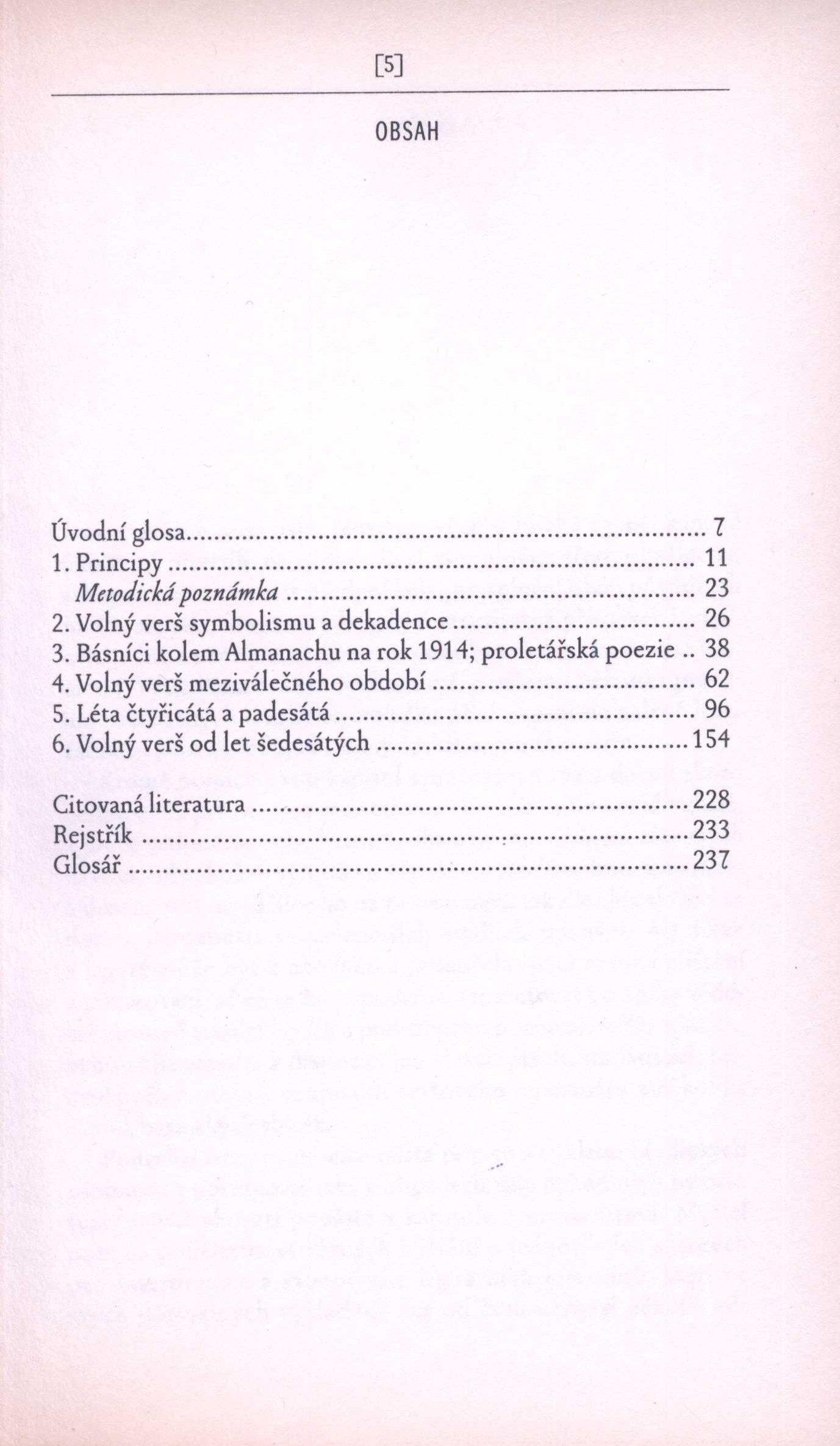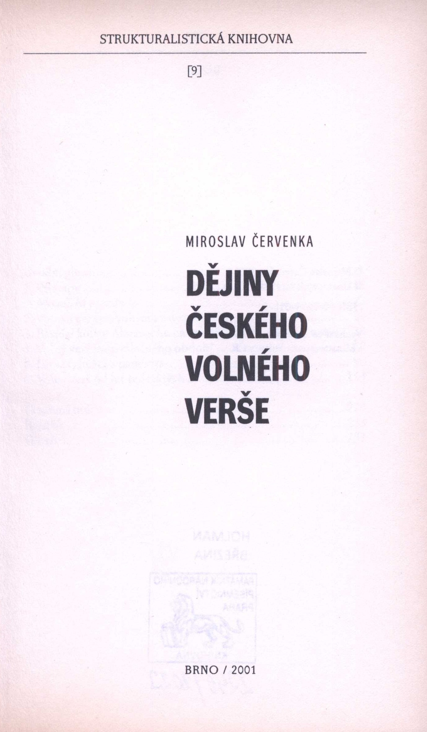 Dějiny českého volného verše / Miroslav Červenka ; obálka a osnova grafické úpravy Boris Mysliveček. -- Vydání první. -- Brno : Host, 2001. -- Reprocentrum Blansko. -- 248 stran ; 21 cm. -- (Strukturalistická knihovna ; 9.). -- Zdobená barevná obálka a vazba. - Zelené předsádky. - Na přední záložce obálky anotace a ediční přehled, na zadní záložce bio-bibliografická poznámka o autorovi s fotem. - Obsah. - Úvodní glosa. - Glosář. -- Obsahuje bibliografii a rejstřík. -- Anotace: Kniha je souvislým vývojovým obrazem dějin českého volného verše. Úvodní kapitola přináší výklad principu rytmu ve volném verši v termínech rytmického zaměření účastníků poetické komunikace, vyjádřeného při tvorbě i vnímání specifickou rytmickou intonací. Následujících pět kapitol konkrétně a na základě individuálního rozboru všech relevantních textů probírá cestu volného verše od jeho počátků v symbolismu přelomu století až po autory let padesátých a šedesátých, přičemž tvorbu zařazených autorů sleduje až do současnosti. Veršový rytmus je pozorován v souhře celé poetiky zkoumaných děl, jejich významové výstavby, v souvislosti s básnickými směry a uměleckou orientací skupin i individualit. Čtenář je tak informován např. o typech poetistické tvorby a o zásahu klasického i pozdního surrealismu, podrobně jsou probrány rytmické styly básníků Skupiny 42, Holanův verslibrismus v lyrice i epice, obraty k volnému verši u autorů starší generace (Seifert, Hrubín, Závada) v 60. letech, proměny rytmu intenzivně spolutvořící básnický vývoj Jana Zahradníčka nebo Ivana Diviše. Jsou rozpoznány a pojmenovány některé přechodné útvary mezi veršem volným a pravidelným. Na pořad přicházejí volné verše desítek básníků — nejmladší ještě sledovaní jsou Petr Král a Jiří Kuběna. V závěru se klade aktuální otázka krize volného verše v současnosti. Jednotný metodologický přístup a systematické sledování rytmických činitelů, jež působí po celé zkoumané období, umožňuje zachycení členitého tématu v jeho kontinuitě, ale nevylučuje ani konkrétní odpovědi na dílčí zájmy čtenáře zajímajícího se o rytmus svého oblíbeného básníka. -- ISBN : 80-7294-015-5 (vázáno).