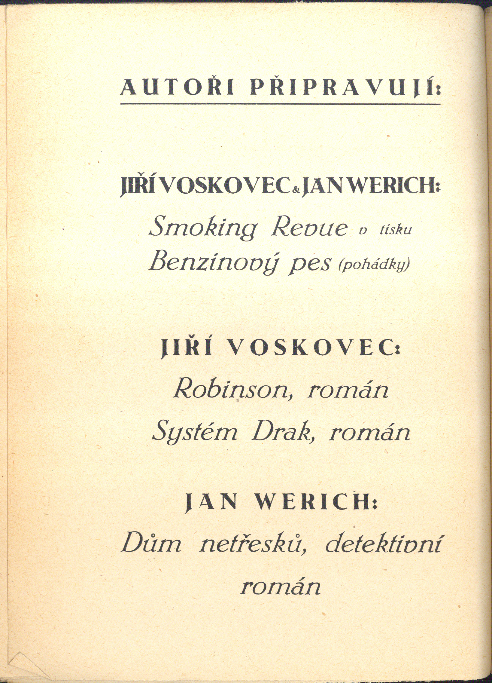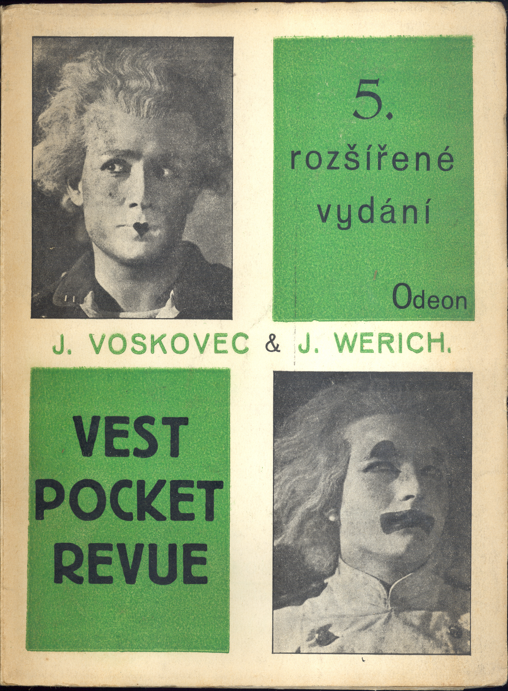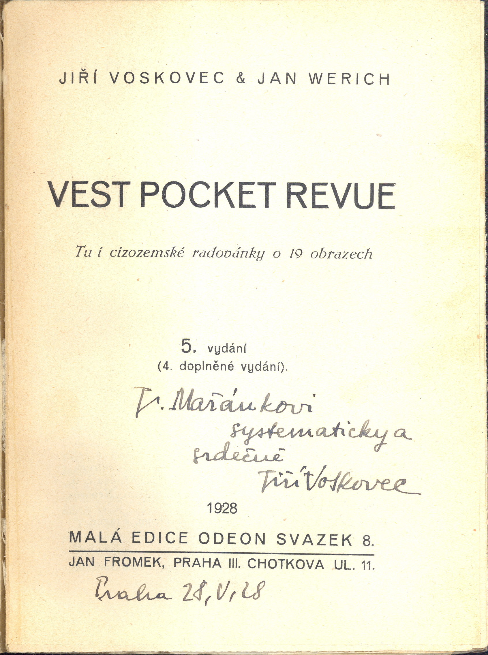 Vest pocket revue : tu i cizozemské radovánky o 19 obrazech / Jiří Voskovec & Jan Werich. -- 5. vydání, (4. doplněné vydání). -- Praha Praha III, Chotkova ul. 11 : Jan Fromek, 1928 (Praha-Smíchov,) tiskem knihtiskárny Bohumil Kopřiva. -- 70, [2] s. : il. -- (Malá edice Odeon ; svazek 8.). -- Zdobená obálka. - Na titulním listu edice. - Předmluva autorů s 1 černobílou fotografií. - Bez tiráže. - Upoutávky. - Na zadní straně obálky nakladatelské upoutávky.