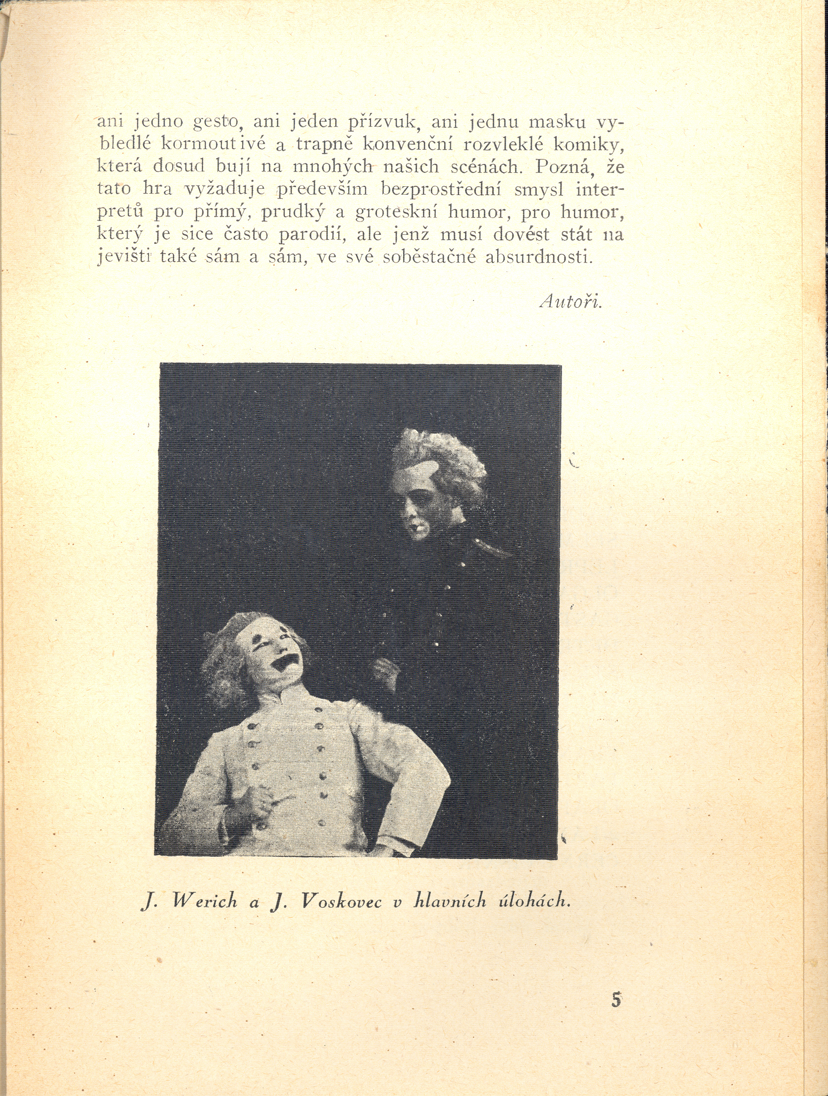 U sign. P 131 d 11 původní dvoubarevná obálka s fotografiemi (K. Teige? - neuvedeno). - Na titulním listě edice, ruční vpisek perem: P. Mařánkovi systematicky a srdečně Jiří Voskovec, Praha 28.V.28. - Na rubu titulního listu tiskárna. - Předmluva autorů s 1 černobílou fotografií ze hry. - Bez tiráže. - Upoutávky na další díla. - Na zadní straně dvoubarevné obálky (černo-zelená), (grafická úprava K. Teige - neuvedeno) upoutávky s reprodukcí 1 ilustrace (O. Mrkvička). - Výtisk v původní, zachovalé obálce, v krajích mírně zohýbané.