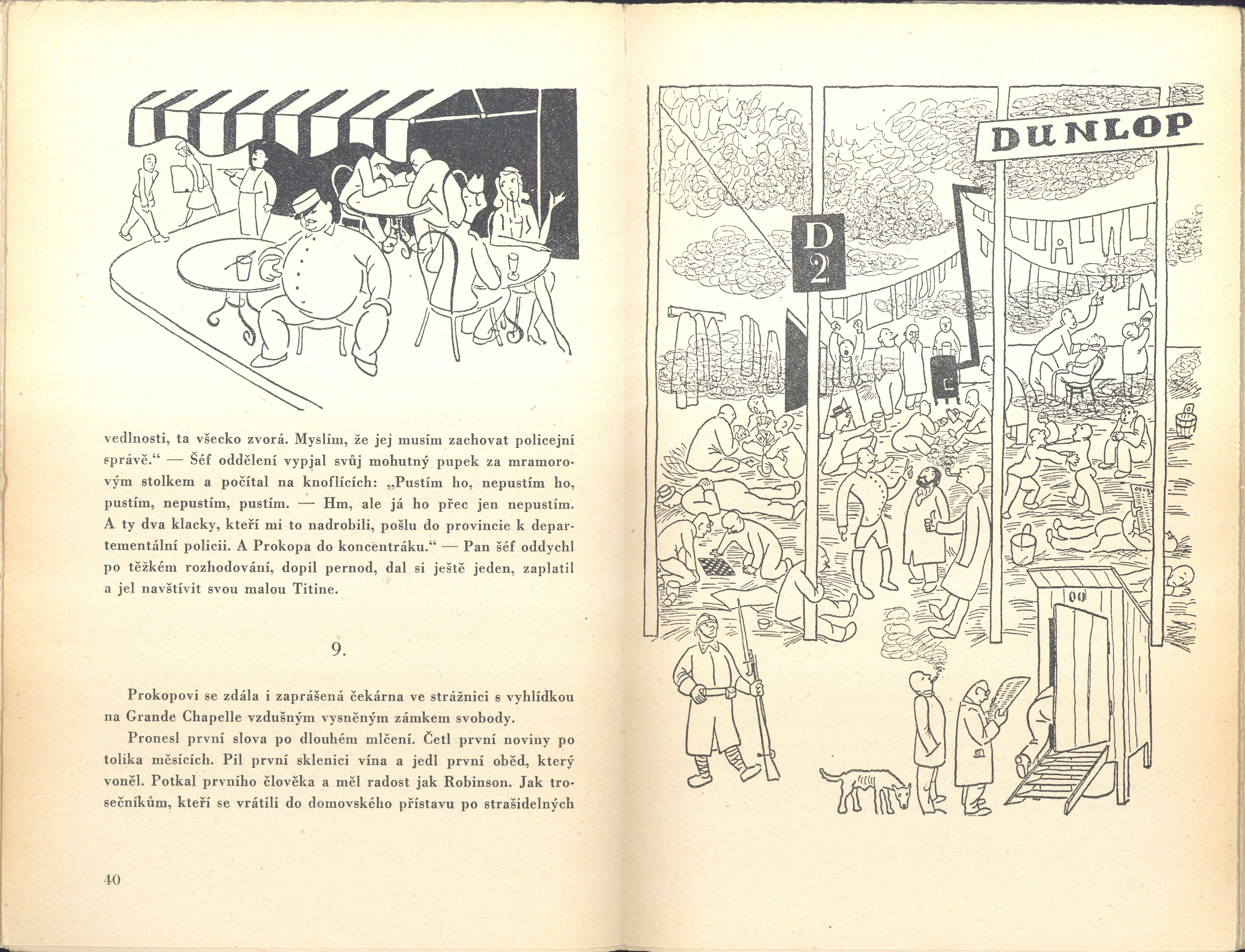 Druh dok. monografie Osobní hesla Hoffmeister, Adolf, 1902-1973 - spisovatel, výtvarný umělec a publicista * Mařánek, Jiří, 1891-1959 - prozaik, dramatik, esejista * Holan, Vladimír, 1905-1980 - básník, prozaik, překladatel Klíčová slova česká literatura * próza * humoristická próza * autobiografické prvky * uprchlíci * Amerika * r. 1938-1945 Žánr/forma české prózy Konspekt Česká próza MDT 821.162.3 * 82-3 * 2-488.85 * (7/8) Uživatelské pole PNP U sign. P 131 c 40 původní obálka (K. Teige) s ilustrací (A. Hoffmeister). - Na přední záložce poznámka o knize. - Na vakátě nakladatelská značka a (perem) dedikace s podpisem autora: Příteli, kuřáku doutníků, záletnému výstředníku poesie a prozy [sic!], Jiřímu Mařánkovi tento námět pro film o veselé bídě běženců srdečně posílá jeho Hoffmeister. Praha, léto 1946. - Titulní list s ilustrací. - Četné černobílé ilustrace, některé celostránkové. - Ilustrace ze str. 97 použita v jiném barevném provedení na obálce. - Tiráž. - Informace o knize na zadním přídeští. - Velmi tenká obálka ve hřbetu narušená, místy oddělená, v dolní části natržená, zašpiněna. - Blok knihy částečně uvolněn od hřbetu, některé listy volné. - Vloženo do ochranné papírové obálky. Sign. Holan 2238 chybí obálka. - Ruč. věn. V. Holanovi s podp. aut. z r. 1946. U sign. OŘíha 281 identický výtisk s původní obálkou, která je dole u hřbetu natržená, na horní hraně zohýbaná; blok se mírně odlepuje od obálky; listy nestejné délky, většinou nerozřezané a částečně volné. Jinak zachovalý výtisk. Tiráž: "Napsal a nakreslil: Adolf Hoffmeister. Obálka: Karel Teige. Vydala: Mladá fronta v Praze. Roku: 1946. V edici: Boje. Svazek: 14. Vytiskla: Mladá fronta v Praze. České vydání: I. Cena: 36 Kčs." Sign. Hoffmeister 445: Osobní knihovna Adolfa Hoffmeistera. - V knize nerozřezané listy. Signatura Přír.číslo Lokace Info P 131 c 40 1090/77-d Sbírka Holan 2238 H02143/98 Sbírka OŘíha 281 0729/2011 Sbírka Hoffmeister 0445 5959/71 Sbírka