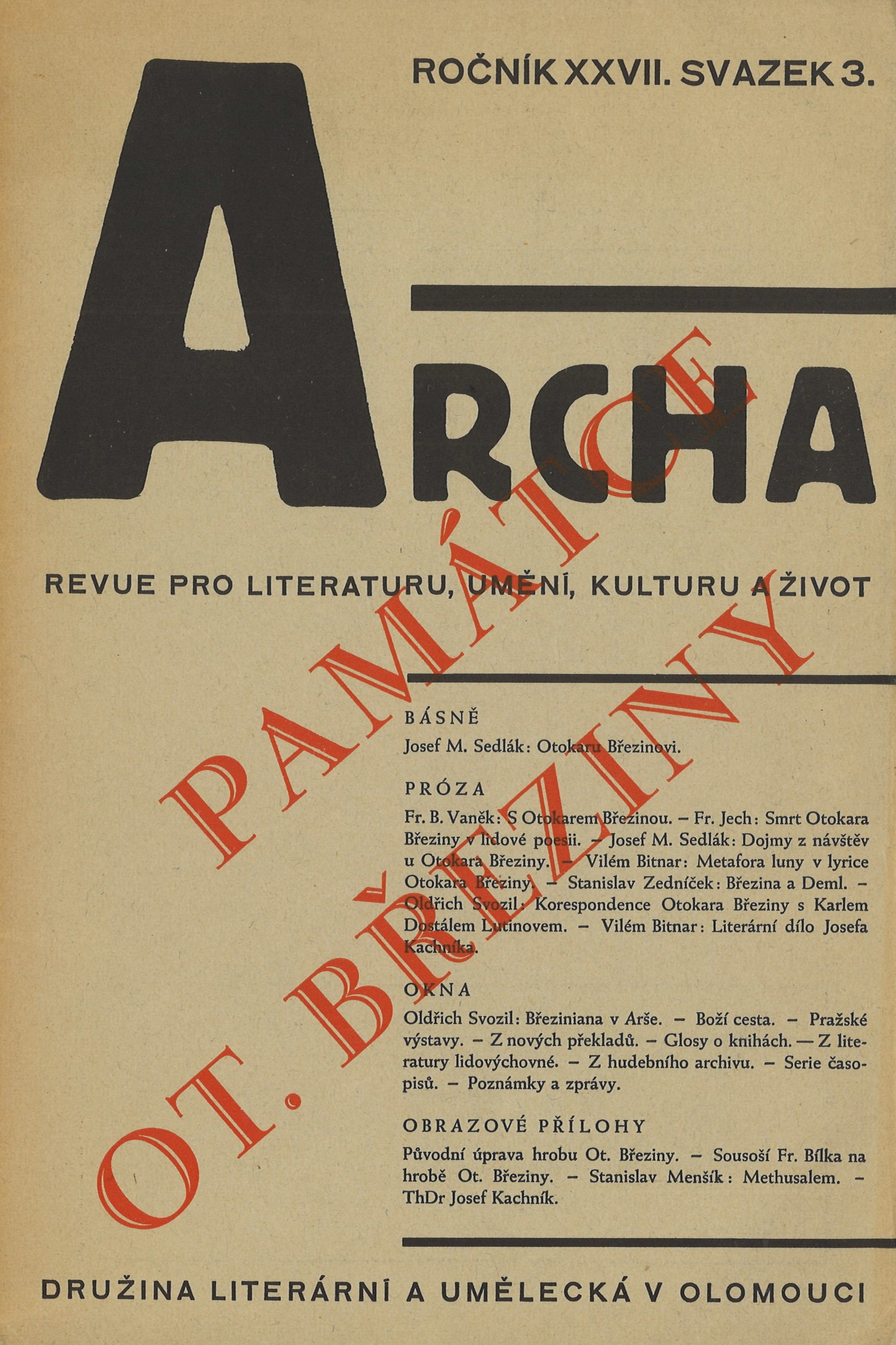 AnotaceVýznamná česká katolická literární revue vydávaná Družinou literární a uměleckou v Olomouci. Časopis navázal na tradice Katolické moderny z přelomu století (na revue Nový život) a na jeho redakci se podílely osobnosti z této literární skupiny. Vycházely zde především básnické a prozaické práce, domácí i překladové, a odborné články a studie z teologie, literární historie a estetiky a nechyběla ani rubrika s literárními kritikami a ohlasy soudobého literárního života. Dvacátý sedmý ročník vyšel jako dvouměsíčník a obsahoval například následující práce: Únor v ráji českých světců a Literární dílo Josefa Kachníka od Viléma Bitnara, Matyáš Bernard Braun od Antonína Horáka, Máchův čin od J. Strakoše č. Březina a Hölderlin od Mil. Zicha a množství básní českých i zahraničních autorů (např. František Nechvátal, Zdeněk Řezníček, J. M. Slavík či František Střížovský). Číslo tři bylo zasvěceno památce Otokara Březiny a obsahovalo mnoho studií a materiálií k tomuto autorovi (např. vzpomínkovou stať Fr. B. Vaňka S Otokarem Březinou, studii Fr. Jecha Smrt Otokara Březiny v lidové poesii nebo studii Viléma Bitnara Metafora Luny v lyrice Otokara Březiny. - (kkper)