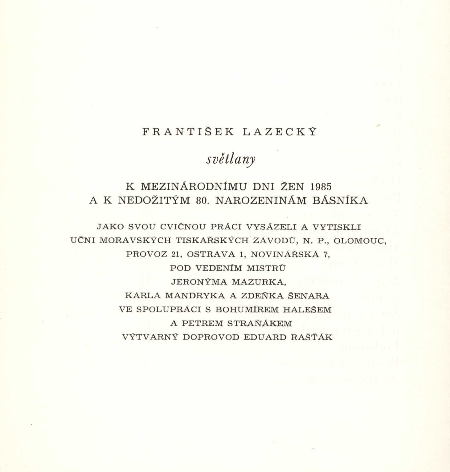 Názvové údaje Světlany / František Lazecký ; [výtvarný doprovod Eduard Rašťák] Osobní jméno Lazecký, František, 1905-1984 (Autor) Další autoři Mertl, Věroslav, 1929-2013 (Dedikant) Lazecká, Květa Rašťák, Eduard (Ilustrátor) Korp. Moravské tiskařské závody (firma) (Tiskař) Nakladatel Ostrava : [S.n.], 1985 Výrobce (Moravské tiskařské závody, provoz 21) Rozsah 37 s. ISBN bez vazby Země vyd. Česko Jazyk dok. čeština Poznámky K mezinárodnímu dni žen 1985 a k nedožitým 80. narozeninám básníka. -- Jako svou cvičnou práci vysázeli a vytiskli učni Moravských tiskařských závodů, provoz 21, Ostrava pod vedením mistrů Jeronýma Mazurka, Karla Mandryka a Zdeňka Šenara ve spolupráci s Bohumírem Halešem a Petrem Straňákem. -- Tónovaná ilustrace na obálce a titulním listu. -- Volné dvoulisty v obálce.