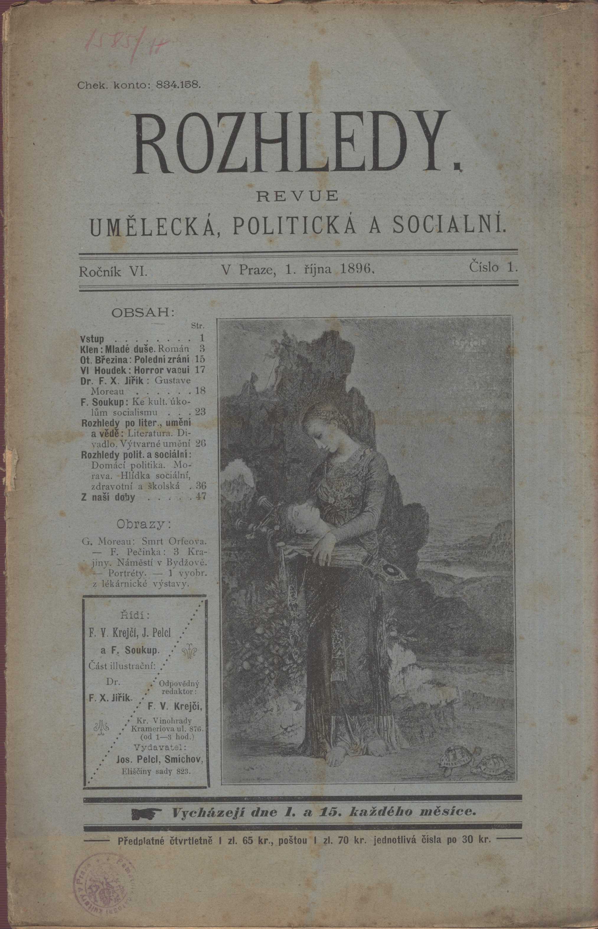 Názvové údaje Rozhledy : revue umělecká, politická a sociální Další autoři Pelcl, Josef, 1861-1916 (Nakladatel, vydavatel) (Redaktor, výkonný redaktor) Braunerová, Zdenka, 1858-1934 (Autor podpisu) (Dřívější majitel) Korp. Edvard Beaufort (nakladatelství a tiskárna) (Tiskař) Roč., číslo Ročník 6, číslo 1-24, 1896/1897 Nakladatel V Praze : Josef Pelcl, 1896-1897 Výrobce Knihtiskárna Edvarda Beauforta Rozsah 1144 stran, 8 nečíslovaných stran obsahu ročníku, 6 nečíslovaných stran obrazových příloh : ilustrace, portréty ; 26 cm Země vyd. Česko Jazyk dok. čeština Poznámky Některé obálky individuálně zdobeny reprodukcemi. - Čb. ilustrace a portréty v textu . - Šest stran obrazové přílohy na křídovém papíře.