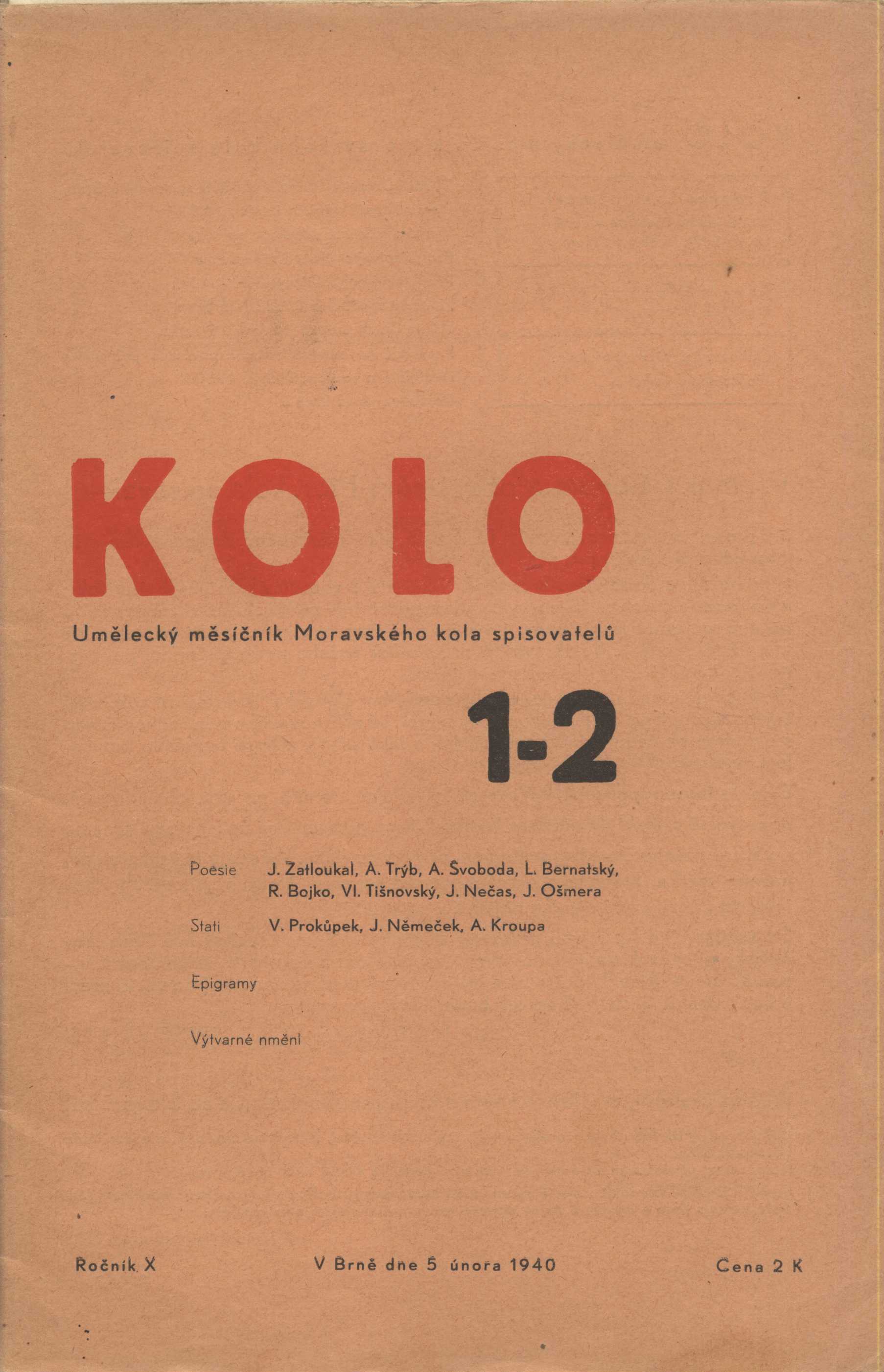 Názvové údaje Kolo : umělecký měsíčník Moravského kola spisovatelů Další autoři Habřina, Rajmund, 1907-1960 (Šéfredaktor, odpovědný redaktor) Veselý, Antonín, 1888-1945 (Redaktor, výkonný redaktor) Bílkovský, František, 1909-1998 (Redaktor, výkonný redaktor) Korp. Družstvo Moravského kola spisovatelů (nakladatelství) (Nakladatel, vydavatel) Obchodnická tiskárna (Blansko, Česko) (Tiskař) Roč., číslo Ročník 10, číslo 1-10, 1940 Nakladatel V Brně : nákladem Moravskéhoho kola spisovatelů, 1940 Výrobce V Blansku : Obchodnická tiskárna Rozsah 546 stran, 2 nečíslované listy obrazových příloh : ilustrace ; 24 cm ISSN 2336-8497 Země vyd. Česko Jazyk dok. čeština Poznámky Čb. ilustrace, fotografie a portréty. - Pravidelné rubriky. - Reklamy. - Obsahuje 3 celostránkové obrazové přílohy na 2 listech: v č. 1-2: "Zátiší" a "Kresba" / Ed. Milén; v č. 5 portrét "Jaroslav Marcha". - Od č. 7 změna podnázvu: Umělecká revue Moravského kola spisovatelů
