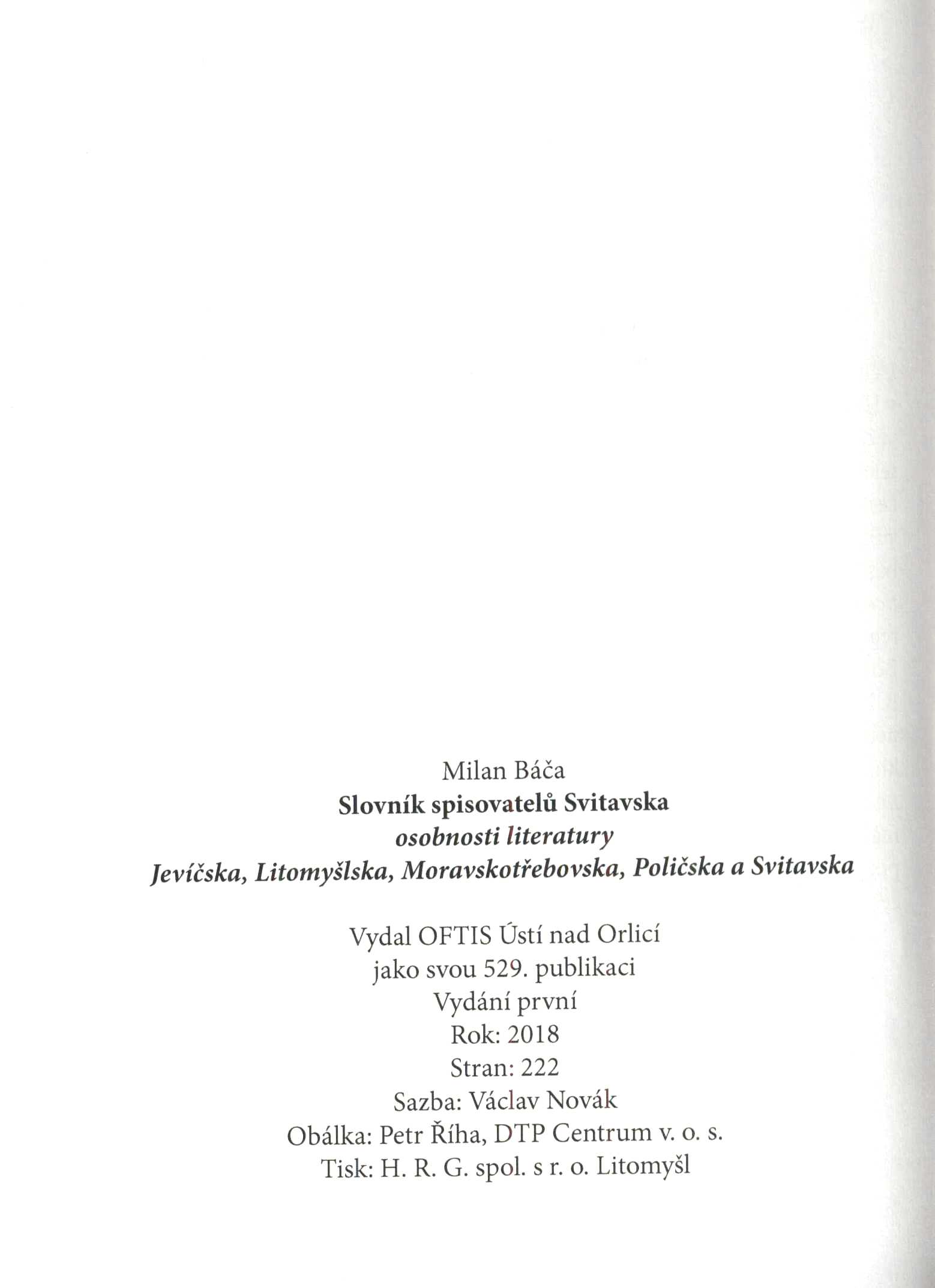 $a Slovník spisovatelů Svitavska : $b (osobnosti literatury Jevíčska, Litomyšlska, Moravskotřebovska, Poličska a Svitavska) / $c Milan Báča 246 30