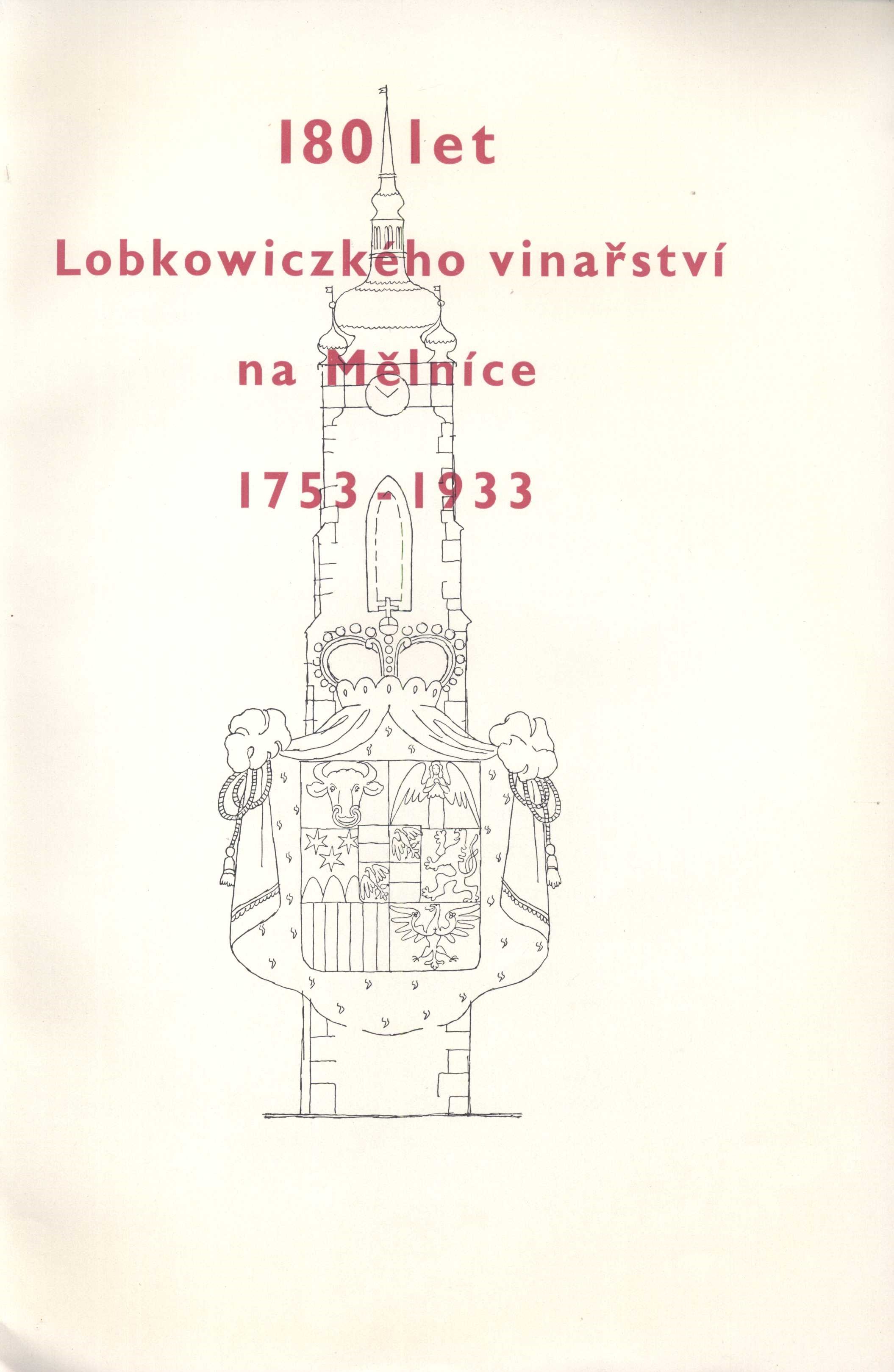 180 let Lobkowiczkého vinařství na Mělníce 1753-1933. -- Na Mělníce : Lobkowiczské zámecké vinařství, 1933. -- V Praze : Průmyslová tiskárna. -- 48 stran, 8 nečíslovaných stran přílohy : ilustrace, portréty, noty ; 28 cm. -- V redakci Mil. Novotného. -- S kresbami Karla Svolinského. -- Soukromý, neprodejný tisk. -- ISBN : (Brožováno).