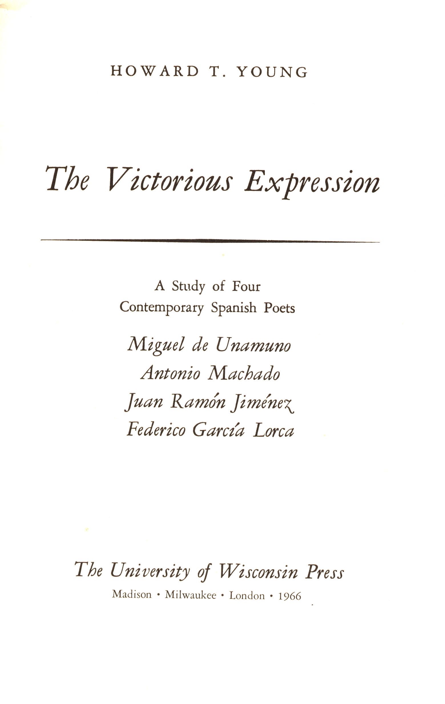 Názvové údaje The victorious expression : a study of four contemporaty spanish poets : Miguel de Unamuno, Antonio Machado, Juan Ramón Jiménez, Fraderico García Lorca / Howard T. Young Osobní jméno Young, Howard T. (Autor) Další autoři University of Wisconsin Press (nakladatelství) (Nakladatel, vydavatel) Údaje o vydání Second Printing Nakladatel Madison : The University of Wisconsin Press, [1966] Copyright ©1964 Rozsah xxiii, 223 stran ; 22 cm ISBN (brožováno) Země vyd. Spojené státy americké Jazyk dok. angličtina Poznámky Barevná zdobená obálka. - Rejstřík. - Na zadní straně obálky anotace.